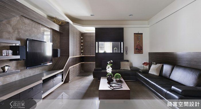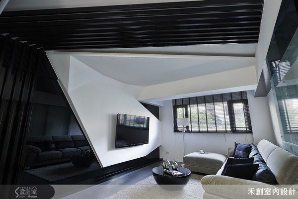 客廳多層次的天花板設計以及古典造型的電視櫃搭配現代感的沙發椅以及沉穩的深色壁紙,將男女主人的不同喜好融合在同一空間中。主臥房延續古典元素的多層次天花板,以及利用裱布包覆的溫潤質感,佐以俐落的線性切割手法,搭配現代感的茶鏡反射,再度讓古典、現代的衝突美表露無遺。