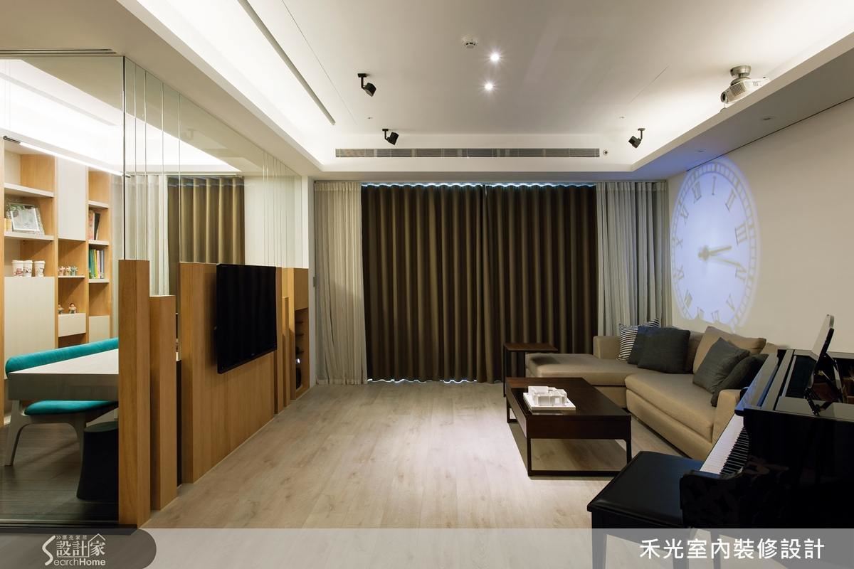 書房空間的天花板,則是採橢圓造型,讓空間設計更具有層次,更是讓空間有向上挑高的視覺設計。開放式的書櫃空間,讓屋主豐富的藏書、收藏品,也能為家烘托出迷人的沉靜氣息。運用鐵件與玻璃來做隔間、活動式的拉門、烤漆玻璃與透光捲簾等建材的選用,都讓空間顯得俐落又兼具生活美學質感。
