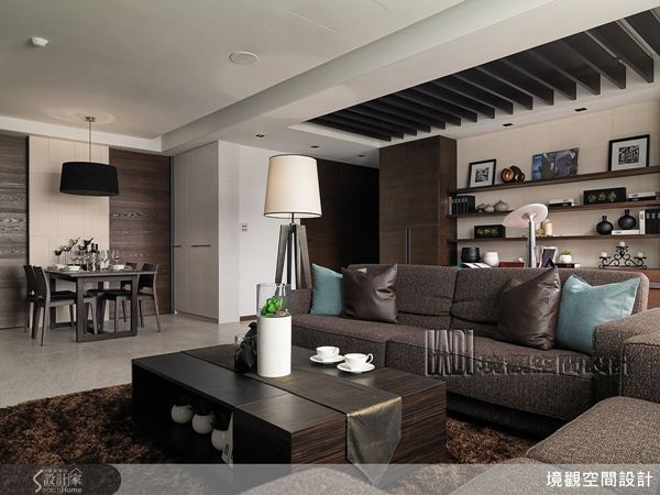 廊道沉穩的烤漆玻璃及玄關轉折後書房內如墨染般的漸層壁紙,加上橡木色鋪陳的地坪,點出屬於中式畫作渲染技巧的深沉意境。穿越廊道後,如隧道盡頭般悠遠的公共空間,以一盞金色燈飾帶出柳暗花明的光明與驚喜。