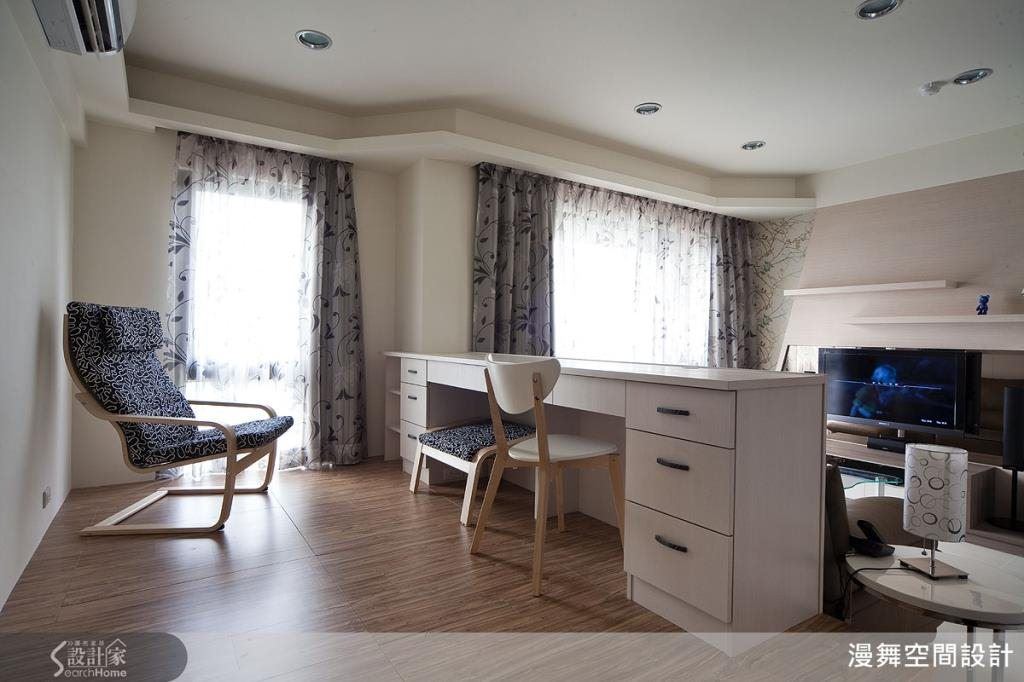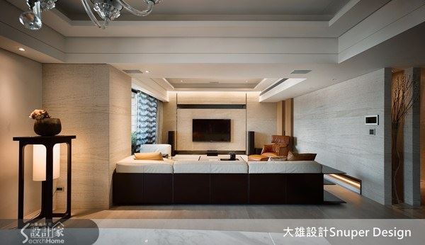 一層層向外擴的渲染技法,用於電視牆的設計也能一目了然。客廳區的電視牆外層採用文理分明的大理石,內層則是深色木格拼貼的設計,層層套疊的視覺延伸,呼應渲染技法。書房區的設計則又是另一番景象,外層木質紋理,內嵌V型拼貼壁紙,將材質解構再重組,呈現藝術風貌。