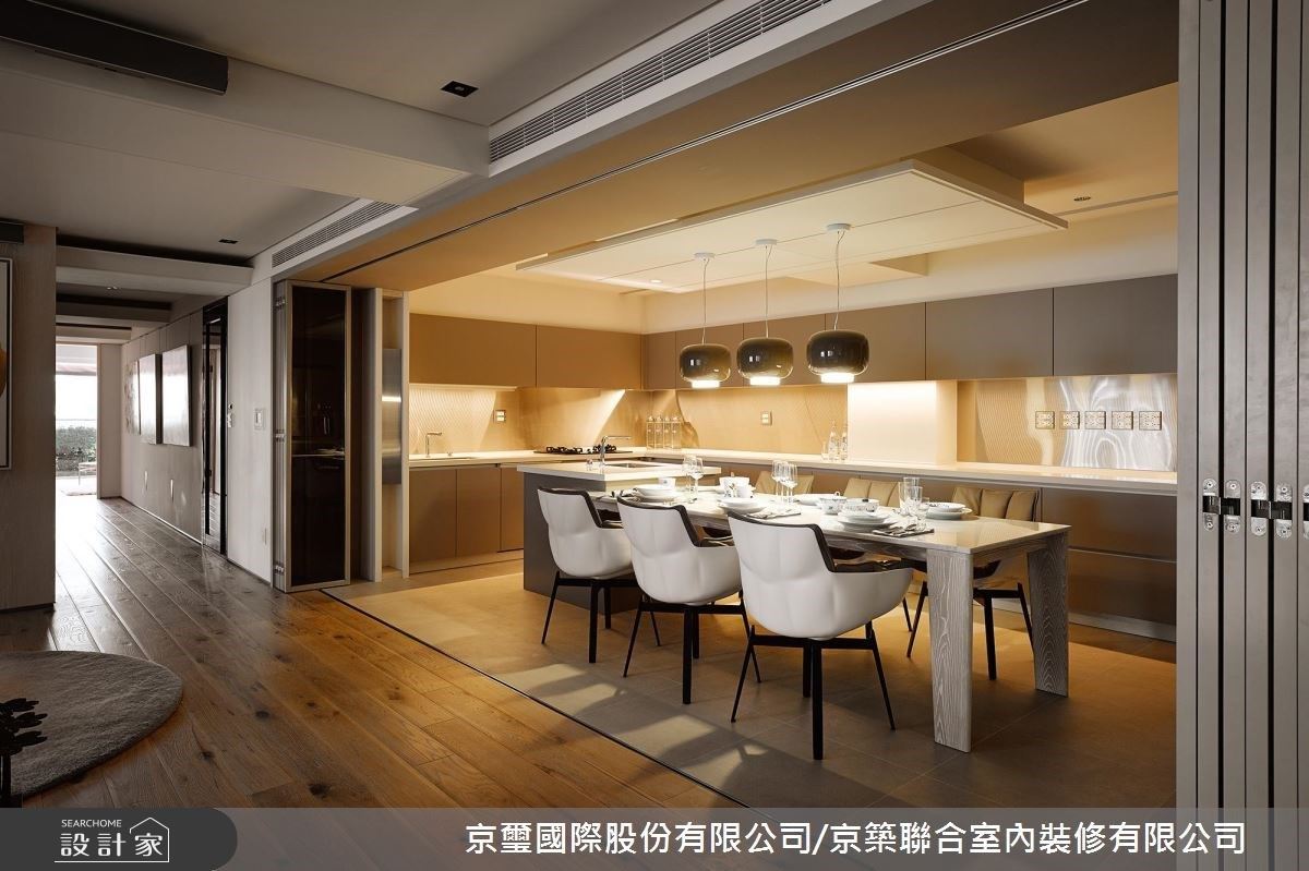 小編很愛做菜,也常邀朋友到家中聚餐,聽唐設計師說,這個屋案是因為喜歡烹飪的女主人,而讓開放的餐廚區成為串連動線的關鍵,看到這個如電影場景般的餐廚區規劃,錯落有致的餐椅搭配,以及那盞吸睛的設計款燈飾,著實讓小編艷羨不已。