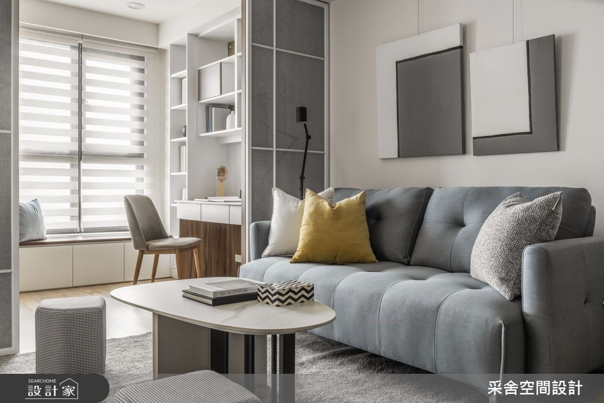 全屋以白色牆面作為主要色調,給予居住空間潔白清爽的感受,並運用線板打造線條美感,結合良好的採光條件,不僅勾勒出空間的層次,也透露出女性細膩柔美的特質;家具選用淺色簡約造型的銀白大理石茶几,搭配著深黑巴洛克風格立燈,點綴些乳牛真皮抱枕,構成優雅時尚的美式風格。電視牆刻意採懸浮設計並搭配燈光,一旁的櫃體因不佔滿整面牆,反而營造輕盈感受;餐廚空間則以一道端景牆結合吧檯,正對流理台,不但化解「開門見灶」的問題,也讓屋主能在用餐時遠眺戶外美景。