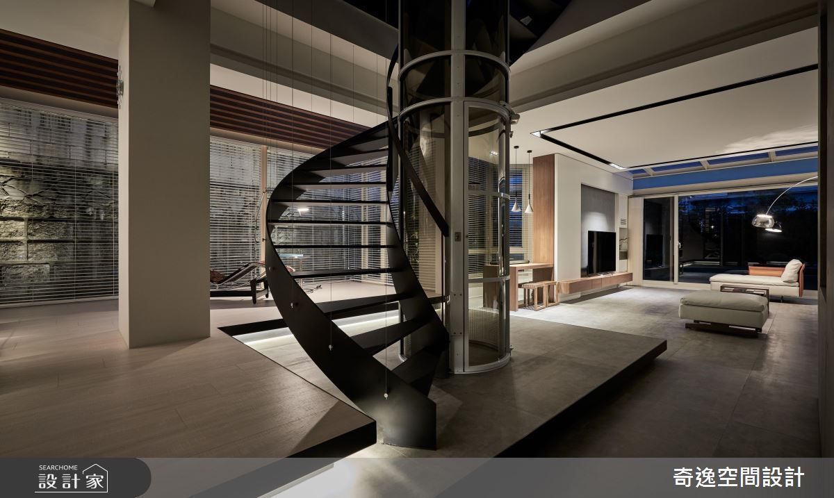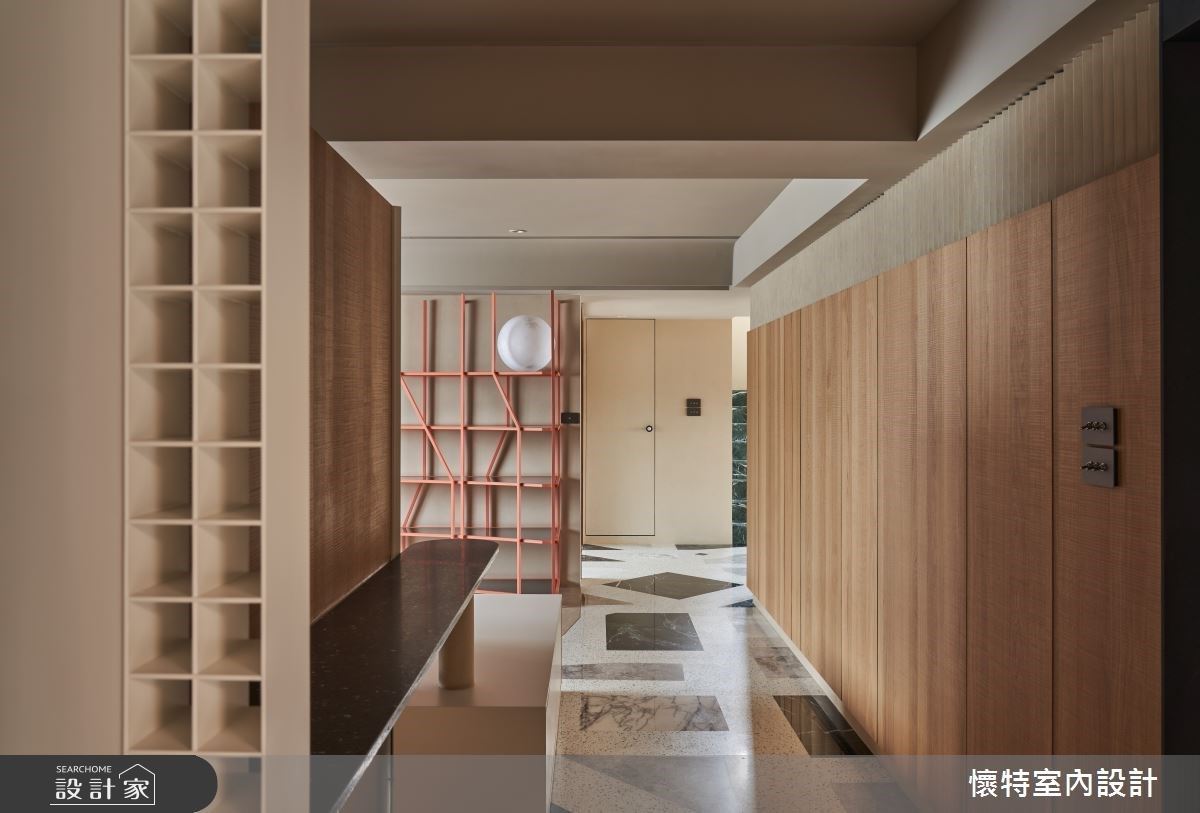 設計師在樓梯的造型上,添加了獨特的巧思,像是挖空設計,讓梯面更有造型。也因樓梯會佔據室內的坪數,更在樓梯的安排,增強收納機能,不僅牆面有著各式尺寸的收納櫃體,樓梯主結構也可進行收納,樓梯壁面則運用幾何圖形,使視覺充滿變化性,展現出空間的亮點設計。