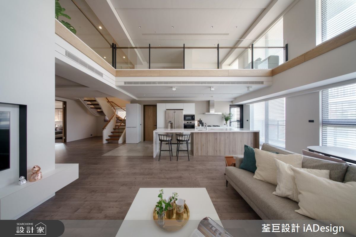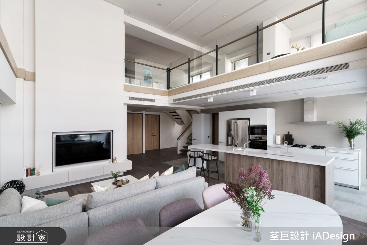 評估過案例空間的格局特色後,設計師利用樓中樓的特點,區隔出公私兩大空間,樓下為客廳與餐廚空間,選用木質貼皮與白色壁面,烘托出溫潤又明亮的空間,襯托出樓中樓獨有的空間挑高感。客廳電視背牆,以 V 字排列,展現出木質紋理獨特之美,一旁的收納櫃體,搭配上燈光,旋即就有藝術展示櫃的優點,點綴出空間的變化性。靠近窗台,可擺放綠意植栽,讓忙碌的生活,添入自然氣息。亞麻色系的布質沙發,配上風格抱枕,素雅的白色牆面,掛上療癒畫作,與客廳空間的木作氣息相互融合,成為全家放鬆休憩的絕佳之處。