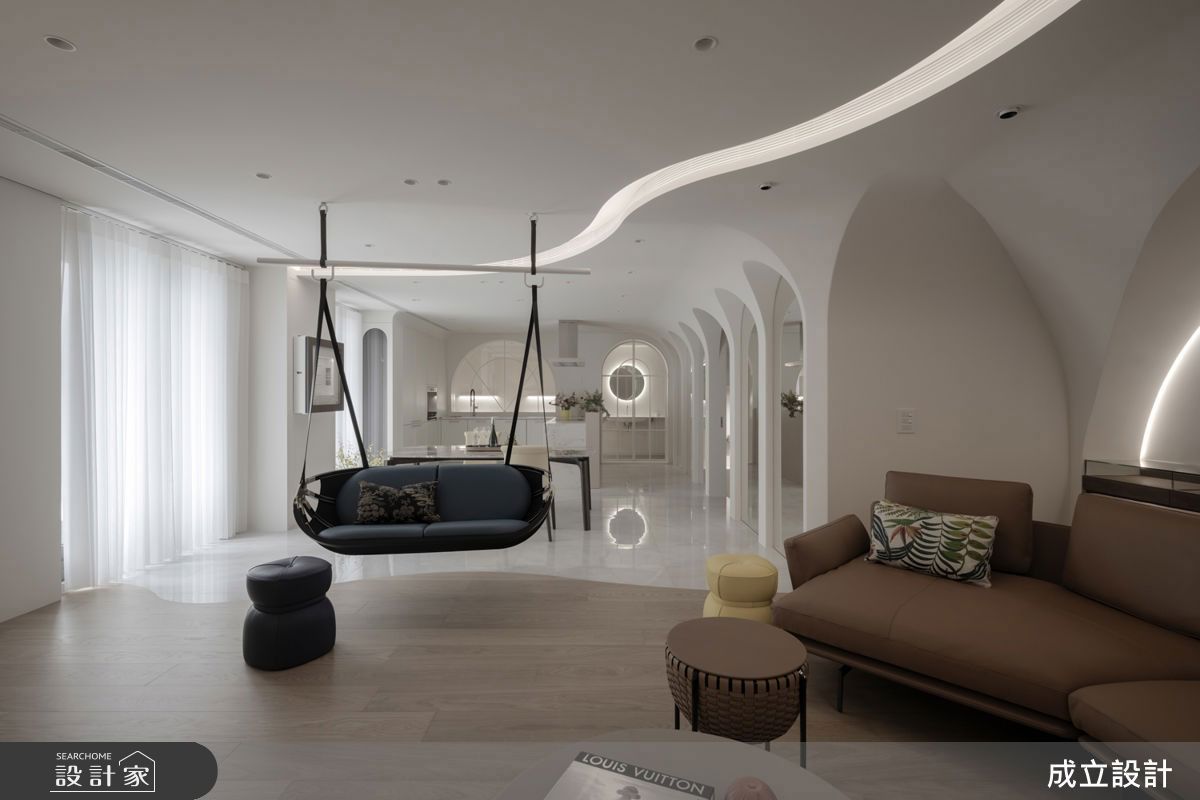 居宅中,可見到開放式規劃的公共空間,設計師整合了客廳、餐廳與廚房區域等,創造流暢穩定的生活動線;並在客廳規劃一面深黑色背景沙發牆,加入充滿藝術格調的牆面花卉裝飾,型塑視覺焦點;延伸進入餐廚區域,則配置一字型中島結合用餐吧檯,增加了檯面的使用主題,同時刻意保留老屋原先的黑色格子窗,於窗外擺放幾株綠意小植栽,讓採光與綠意增添空間情調;在書房領域內,則以大量的櫃體滿足書籍收納需求,同時以屋主偏愛的灰藍色作為色彩基調,打造出令人放鬆的工作領域;而主臥空間則以大面積木質鋪陳床頭牆,並於窗畔邊配置臥榻區,同時陳列一座小酒架,成為屋主私人的紓壓小天地,並結合生活動線,打造出一間收納量充足的專屬更衣室,在鏡面與櫃體的配置下,塑造機能、美感兼併的生活場域。