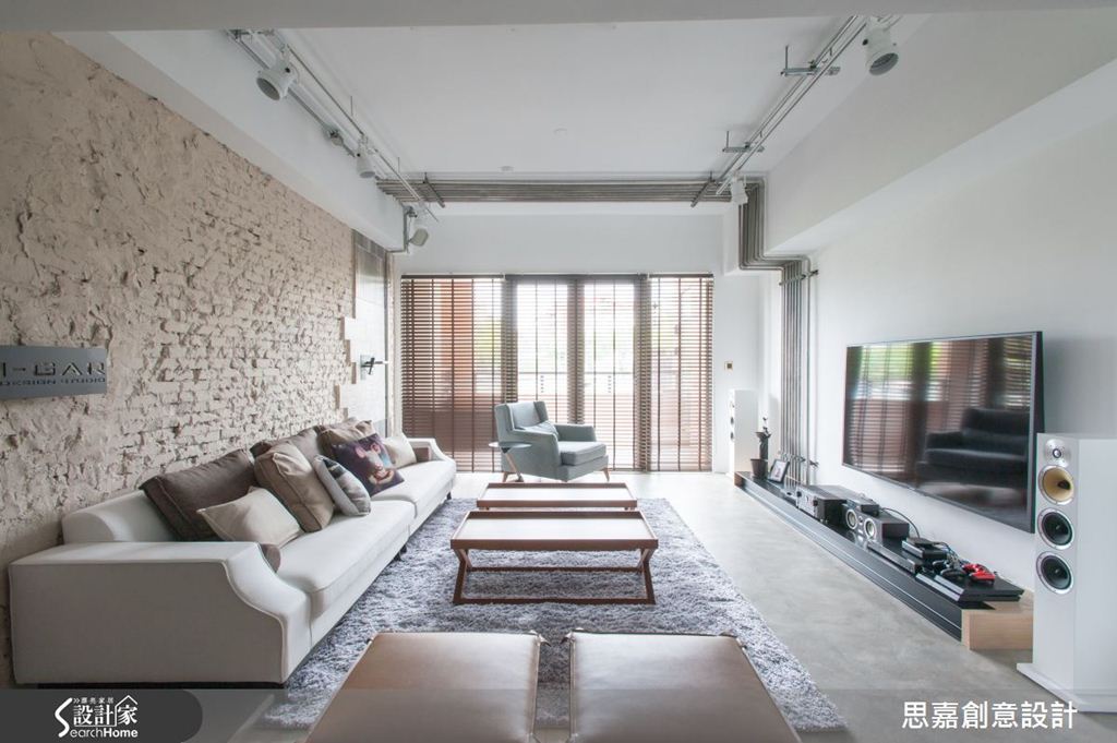 在玄關處就有人文感的創意迎面而來,設計師規劃了一面充滿歲月痕跡的紅磚牆面,在打毛處理的水泥牆上拼貼紅磚,不僅營造出石材剝落感,也替家增添懷舊時代的溫暖;再以鐵件製的隔屏界定區域,讓玄關也享有流通的美好採光;設計師在整個公共空間地面使用超耐磨木板,耐磨、耐髒的特性特別適合有小孩的家庭。而整面大落地窗的規劃引入陽台外的自然光,讓客廳顯得溫暖、舒適,也能欣賞外頭的河景,塑造一個最令人放鬆的紓壓空間。設計師選擇的寶藍色沙發,在一片大地色系中成為一大亮點,有畫龍點睛的效果;而一面不做滿的電視櫃,則形成客、餐廳之間的穿透設計,並在櫃體背面結合置物和展示的功能,別具巧思的複合式機能規劃,相當創意的巧思。