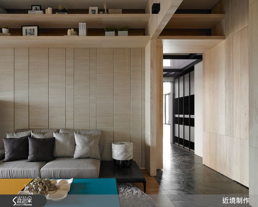 原空間格局只有一房一廳,而且採光面正好被擋在主臥室外面,讓客廳顯得很陰暗。從採光與坪數效益的考量點出發,張總監將主臥室挪移至格局右側,而將採光面旁的明亮區域定義為客廳區,不但讓整體空間的採光與通風條件大為提升,而且室外陽台的綠意景觀也成為客廳最美的風景。