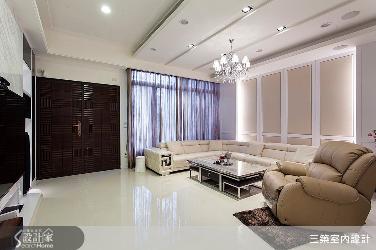 采豐國際室內設計主持設計師葉懷恩在這個廣達 62 坪的自地自建案例中,運用家具定位,在大坪數空間裡大玩虛虛實實的戲法,同時把客廳內退 1 公尺,一方面作為放置大冰箱的厚度壁面,二方面則利用大片窗戶外向借景,將室內外綠意連成一氣。由於屋主喜愛潔淨清爽的空間,於是採取白色為主調,但設計師運用大理石天然的美麗花紋成為串聯空間的語彙,從電視牆到玄關畫作,再延伸至書房,每一個角度都像獨立又連結的展覽區,營造豐富的視覺享受,也紓緩了過冷的白色主調。