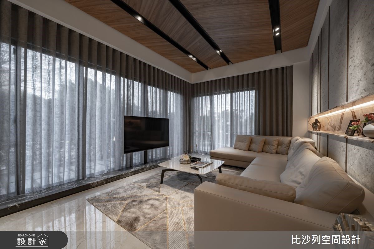 善用挑高近 6 米的優勢,客餐廳連成一線,主臥起居室則規劃在二樓,一眼即能飽覽一樓的客廳背牆設計及戶外景觀,不只達到屋主期待的視覺開闊要求,更讓坪效犧牲換來最大的生活尺度。