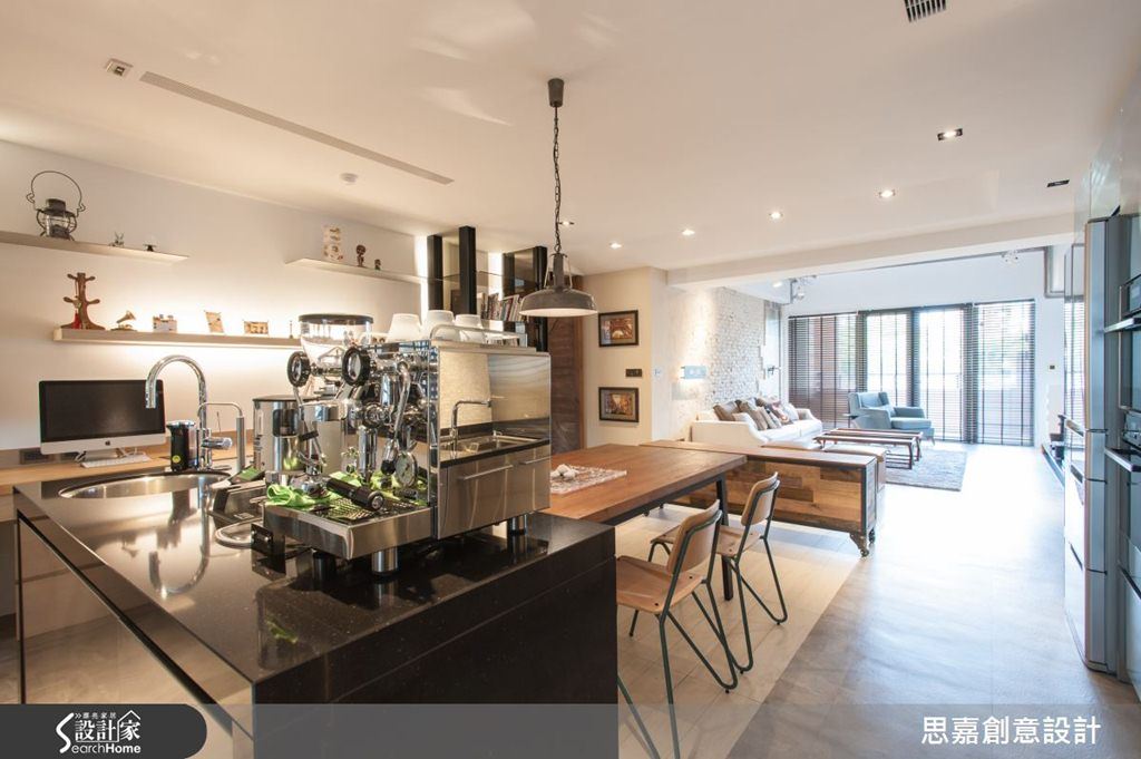 以紫色人造石作為吧檯桌面材質,底部則加入漫畫櫃設定,注入閱讀、輕食等多重機能,並在加長的量體配置下,打造廚房、餐廳之間的領域界定,也成為一道進入私領域的導引軸線。設計師透過此吧檯作為空間主角,發展出周邊的軟件、材質計畫,混搭出具歐美感的居家面貌。