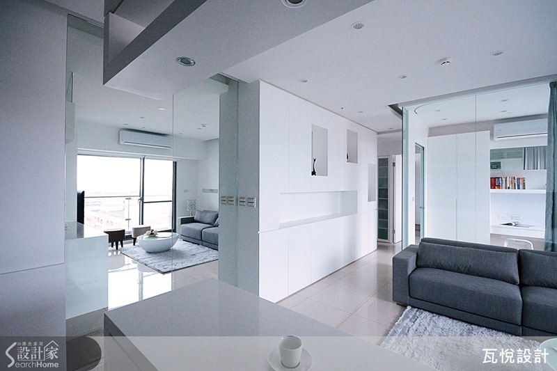 設計師善用空間,特別規劃出夾層客廳,讓 13 坪數的空間也能享有兩廳,加上大量使用單一色系與玻璃透視做輔助,減少屋內的間隔感,讓整體空間在視覺上更顯寬闊許多呢!