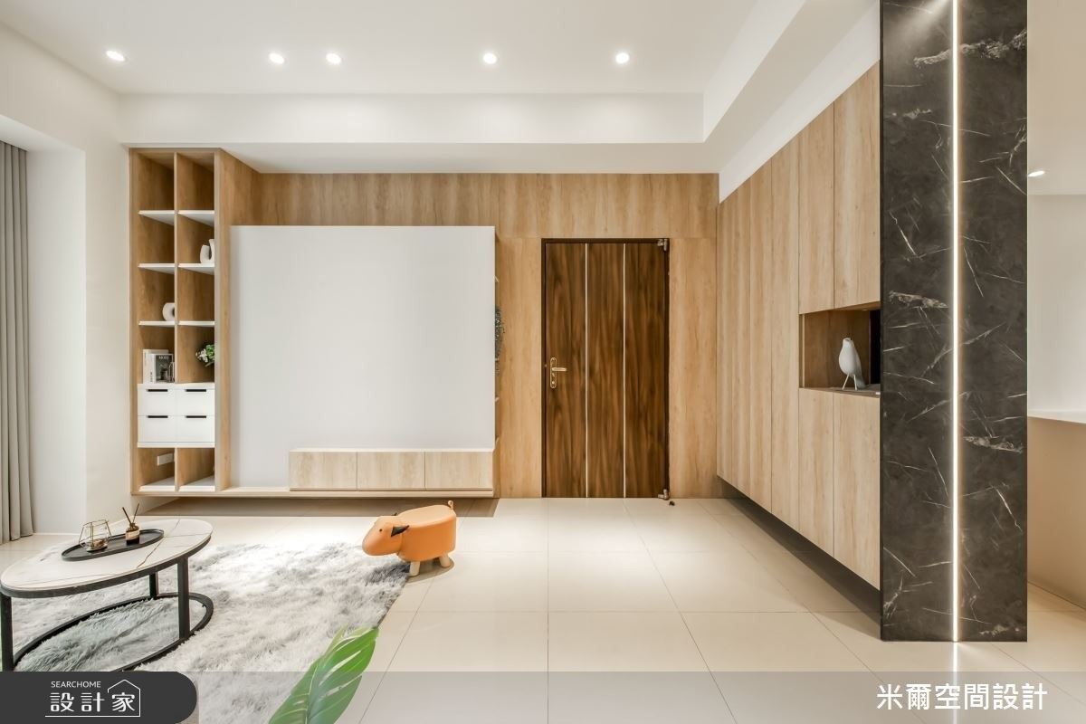 屋內家具皆是量身打造,皆兼具美觀與收納機能的家具,例如客廳臥榻下方附置物功能、沙發後方則是造型收納矮櫃,木製門片後為大型收納空間,再再顯示設計師匠心獨運,給予居住者多元的居住空間。