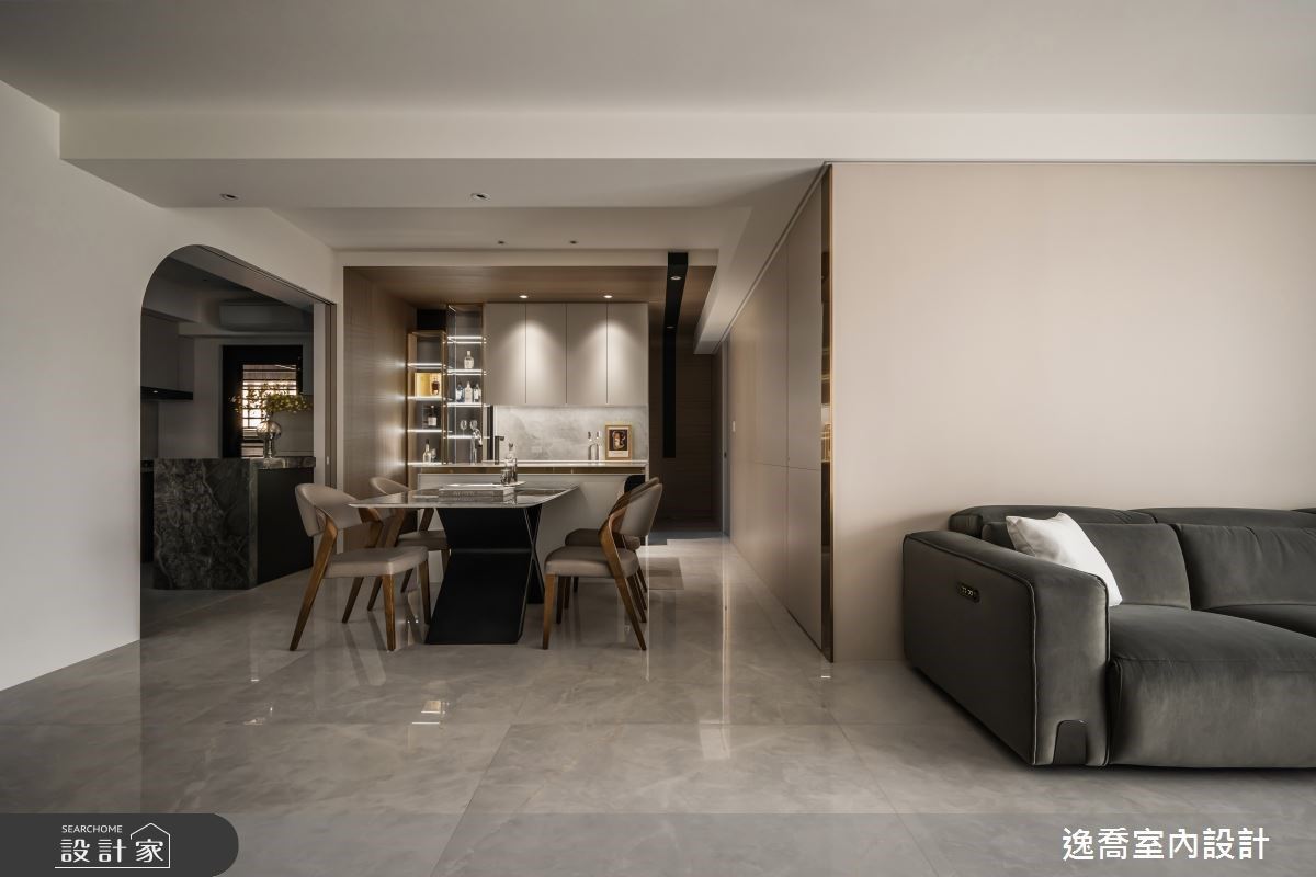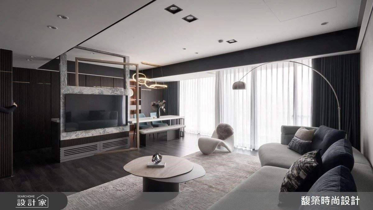 潔白的客廳與明亮的採光形成清新舒爽的氛圍,搭配淺色滾邊沙發與黑色邊桌,有著黑白的時尚品味,設計師將木作包覆的電視牆獨立製作並往前推移,使得空間不至於過度空蕩,並在後方牆面利用浮凸造型線板製造大面積收納空間。沙發旁的懸空置物櫃體使整體空間顯得更加輕盈, L 型的門片設計同時兼具展示與收納功能,同樣潔白無瑕的餐廳與廚房利用長型餐桌使空間和諧。舖設木質地板的主臥床頭的方型軟墊設計優雅又大器,整個牆面的木作收納櫃體設計使機能性倍增;乾溼分離的浴室同樣也散發極度簡約的氣息,使沐浴時得以放鬆身心。