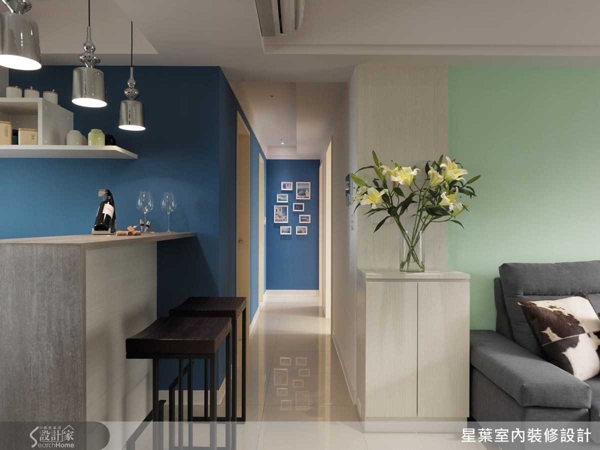 在國外求學,獨自生活多年的年輕女屋主,喜歡看書更甚於看電視,最愛下廚和三五好友共享美食,希望有一個設計簡約卻能像飯店一樣舒適的家。邑舍設計團隊將書房移到光線良好的客廳,並設置整面線條俐落的大書牆,讓女屋主有個寬敞的閱讀空間;並且突破制式設計,將沙發居中擺放,當作無界線的隱性區隔,也留出書牆前的走道。