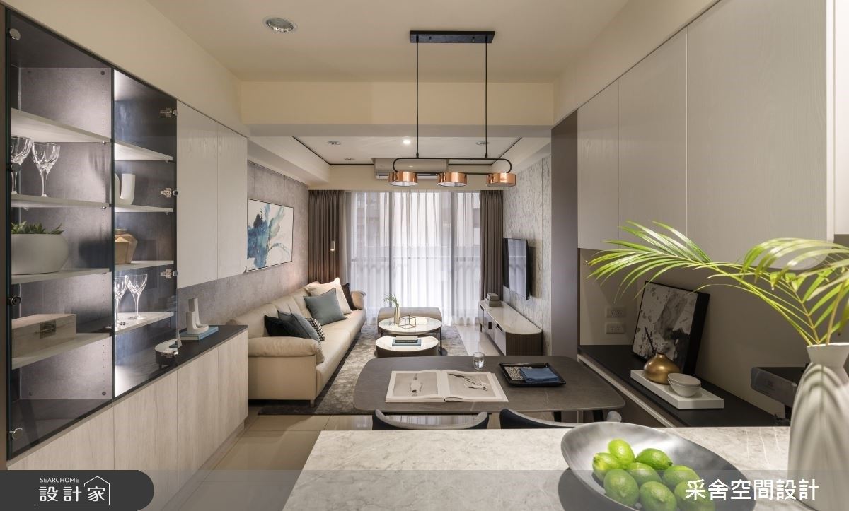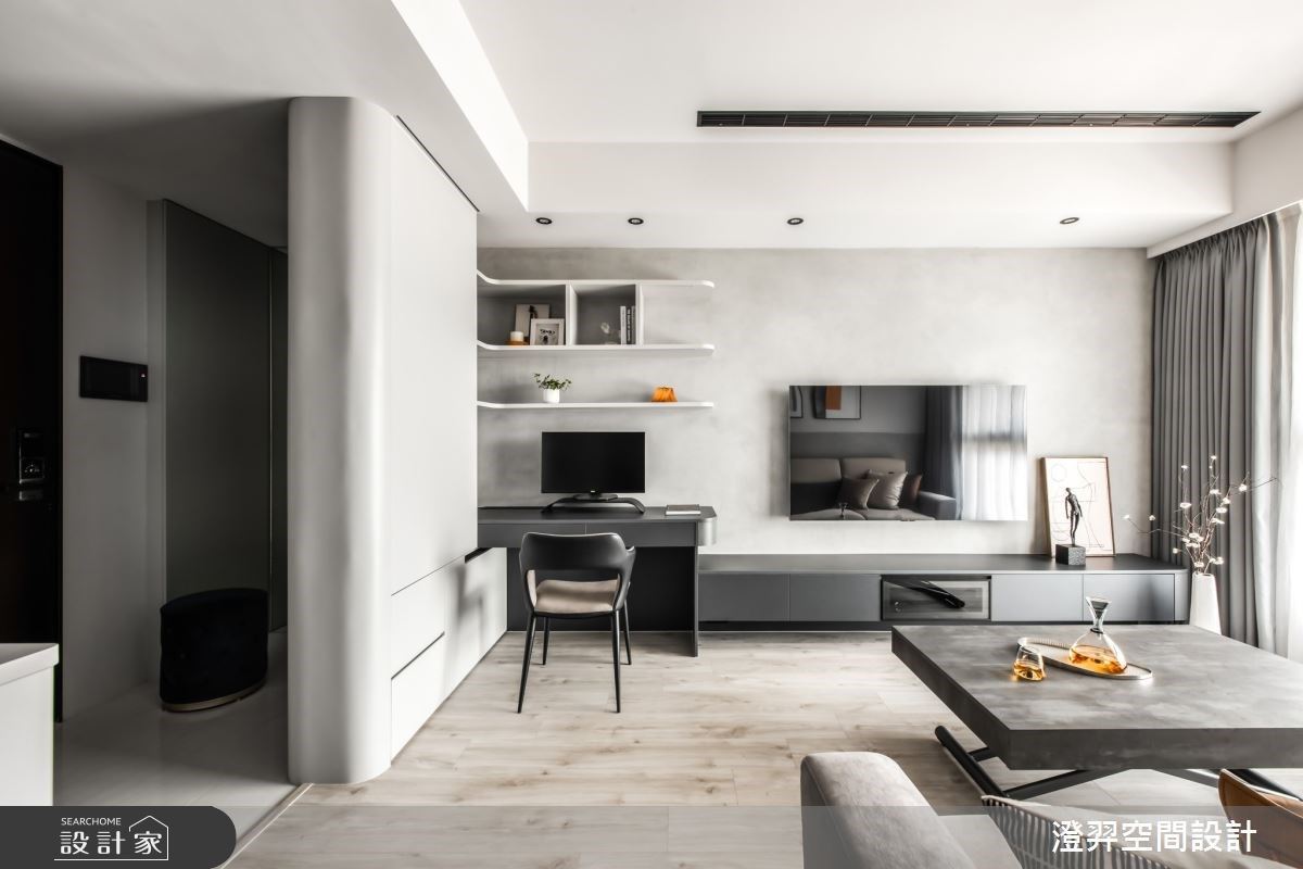 以大量鐵條建構垂直線條,衍生充滿秩序的整齊感,佐以局部挑高與通透感設計,營造放大、拉高的視覺效果;且在靠廚房處融入一座旋轉樓梯,以圓弧曲線調和垂直線性,帶出居者剛中帶柔的性格。