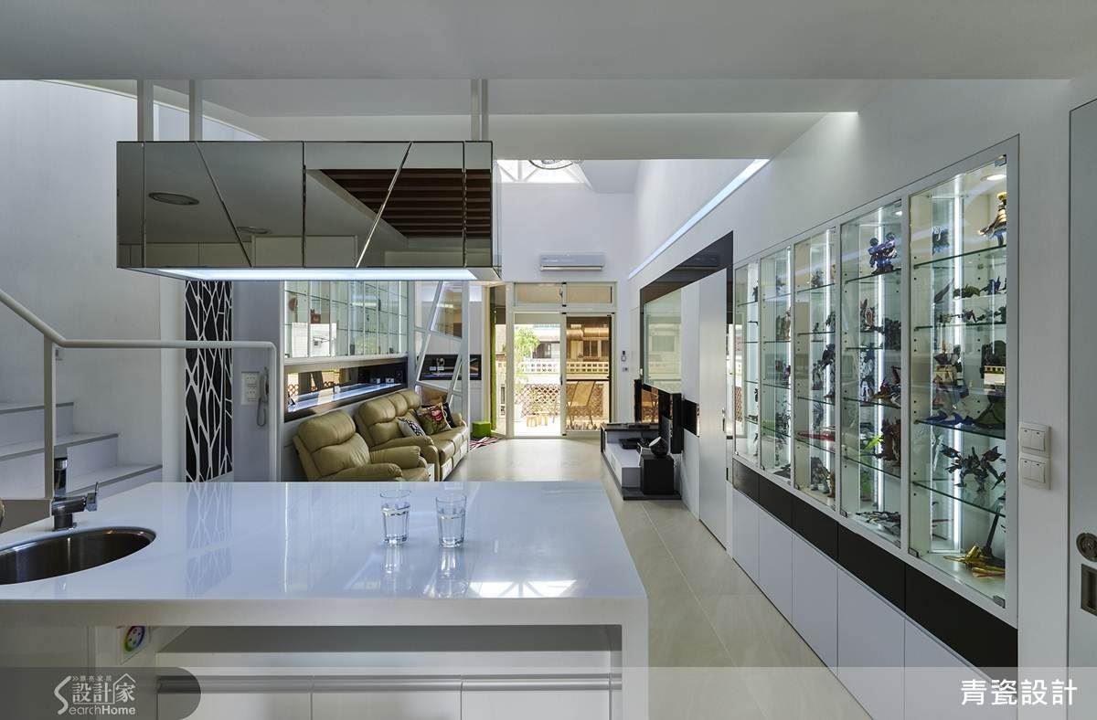 擅長規劃白色空間的顏善松設計師,對於比例、動線與材質的應用相當注重,如何在不同的白色材質中,堆疊出獨有的空間氛圍,經得起時間的淬煉相當重要。自玄關入門,結合木作打造出的座位區與大片玄關櫃,一路延伸至廚房,在純白的材質中,增加黑色鐵件勾勒櫃體與座位區,帶出立面的層次性。並且利用挑高4米2的空間增設夾層,以玻璃為隔間,讓空間視覺放大外,也映照出空間的虛與實。