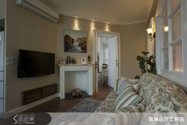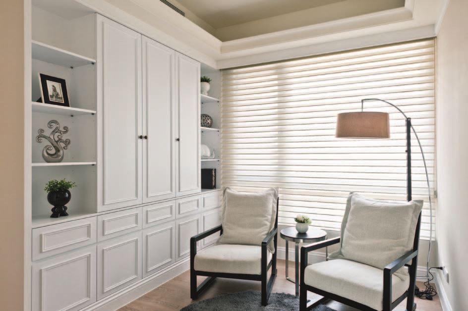 35 坪長型空間中,臥室、書房及廚房將客餐廳包圍,隱藏在美式線板門片後,乾淨俐落且營造了全然溫馨氣息。客廳在米綢色調與暈黃燈光的籠罩下,彷彿身處高規格飯店套房;設計師別出心裁,將電視牆設計為壁爐造型,優雅的多層次線板搭配大理石檯面與進口壁紙的使用,顯得相當大器沉穩。沙發背牆接續臥室門片,有著一致的框線結構,視線流暢且賞心悅目,曲線柔美的復古家具與淺色沙發,在落地燈罩與嵌燈的光影中,更顯浪漫。