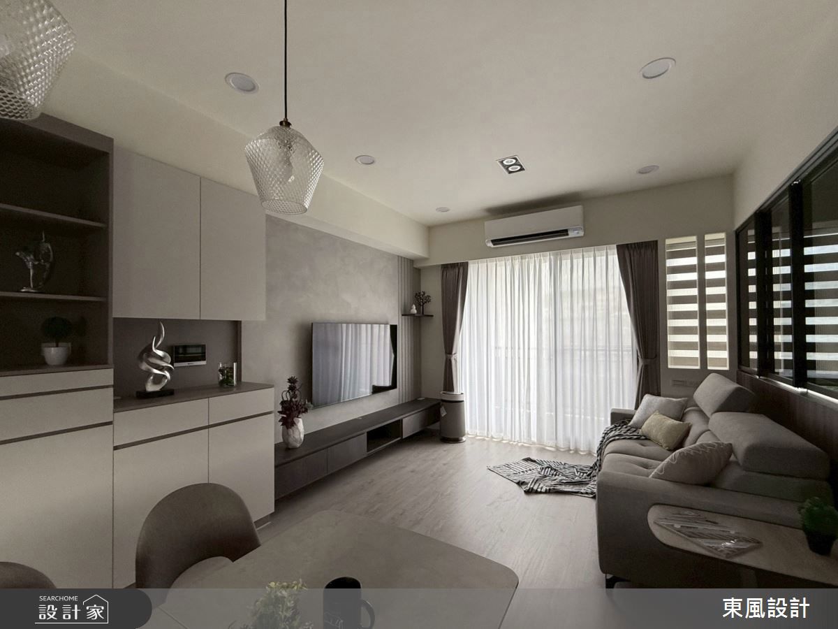 窗外流瀉的自然日光,穿透開放式空間,自客廳延伸到餐廳,無論是否有造型吊燈上的微醺光點,皆別有風味。四人長桌旁的米色櫥櫃,交織的門片富有美式鄉村風情,更擁有大面積收納空間,將機能隱於美觀身後。拱型玻璃拉門後方,即是靜謐的閱讀小天地,沐浴在明亮的臥榻上,更能體會設計師在雙面採光上的巧思。
