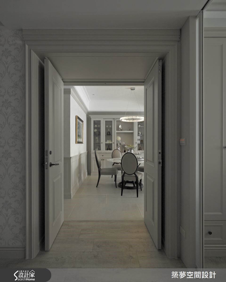 客廳大理石電視牆平行結構柱,不阻撓光的動線,身兼一體兩用的書牆,規劃出半開放式書房。餐廳以歐式簡約的古典傢具,強化新古典的空間風韻,一旁連結主臥的雙開門更是放大空間感的關鍵設計。