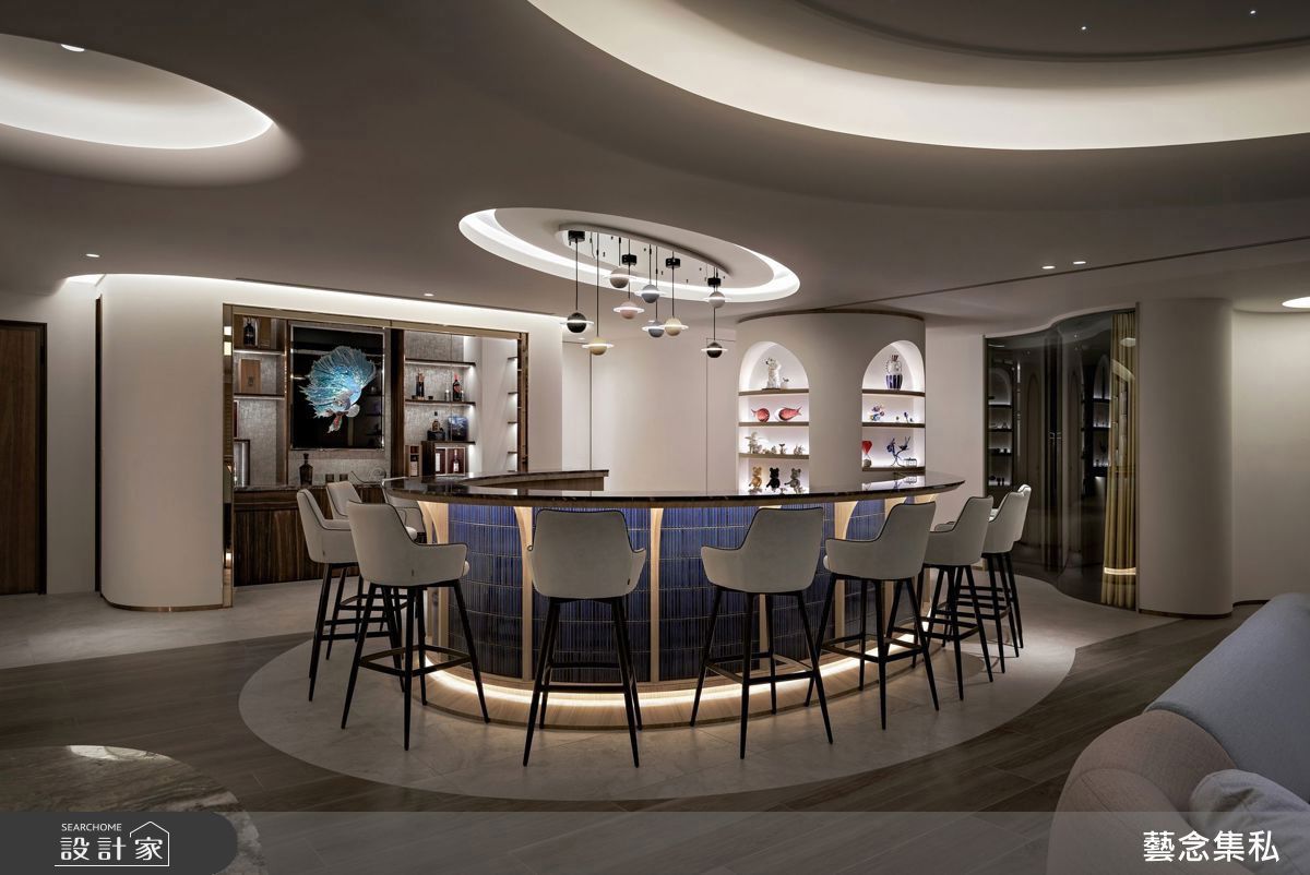 燈光與材質的混搭運用一向是 Jerry 的拿手強項,例如這座嚴選風化老木材打造的吧檯,為空間帶來溫潤的人文氣質,再搭配裝飾主燈的復古造型與暈黃光影,點亮屋主的品酒時光,透過如此簡單卻細膩的設計精神,讓生活質感更加溫暖而療癒。