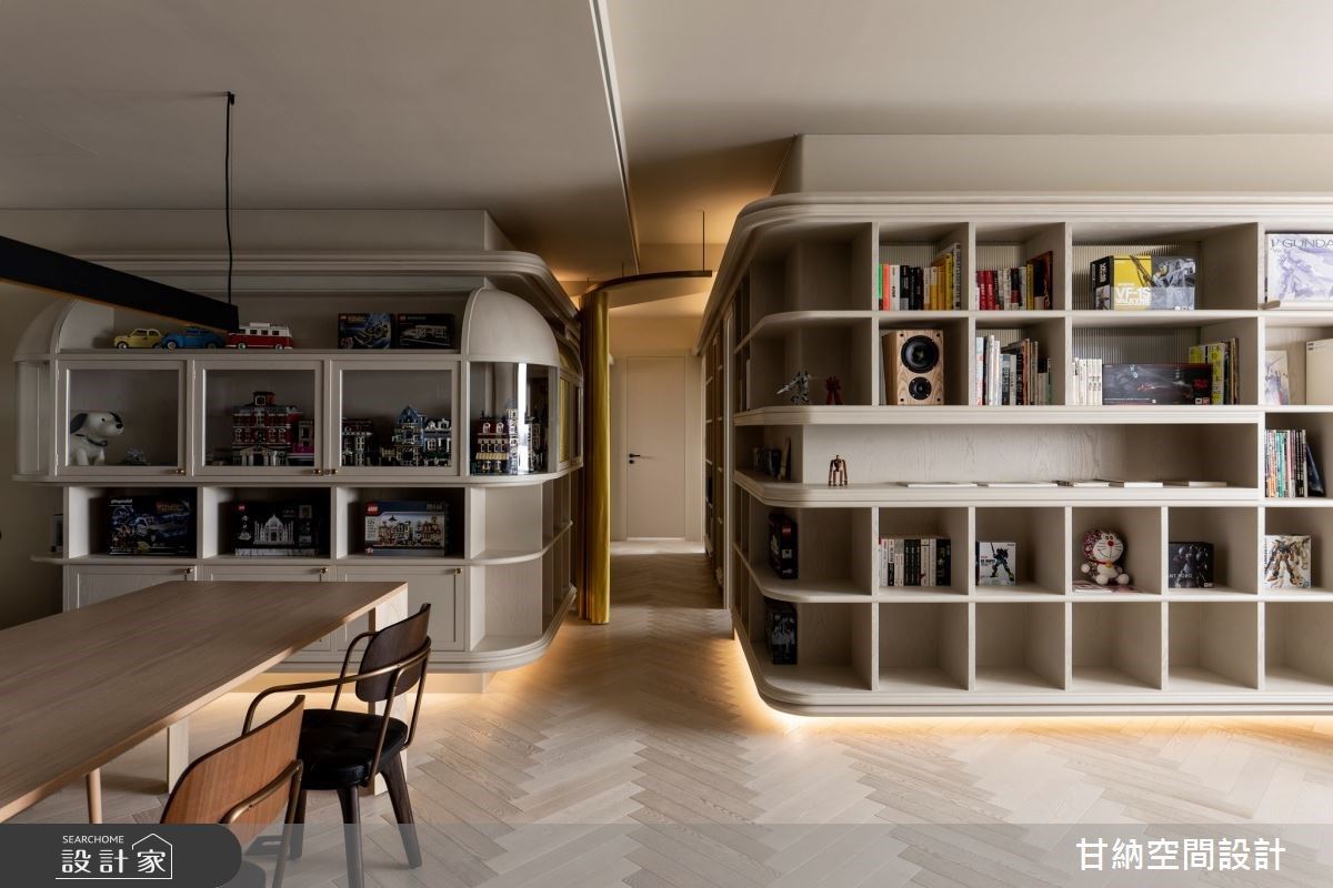 28 坪住宅輕裝修後,打掉客廳旁的一道隔間牆,重新規畫一個公共空間的過道,將木紋 PVC 地坪切割長條狀,再以人字形拼貼,從壁面一整個延伸到天花板,形成 ㄇ 字型的拱廊,彷彿展覽廳般的大器設計,讓視野更開闊、更有亮點。