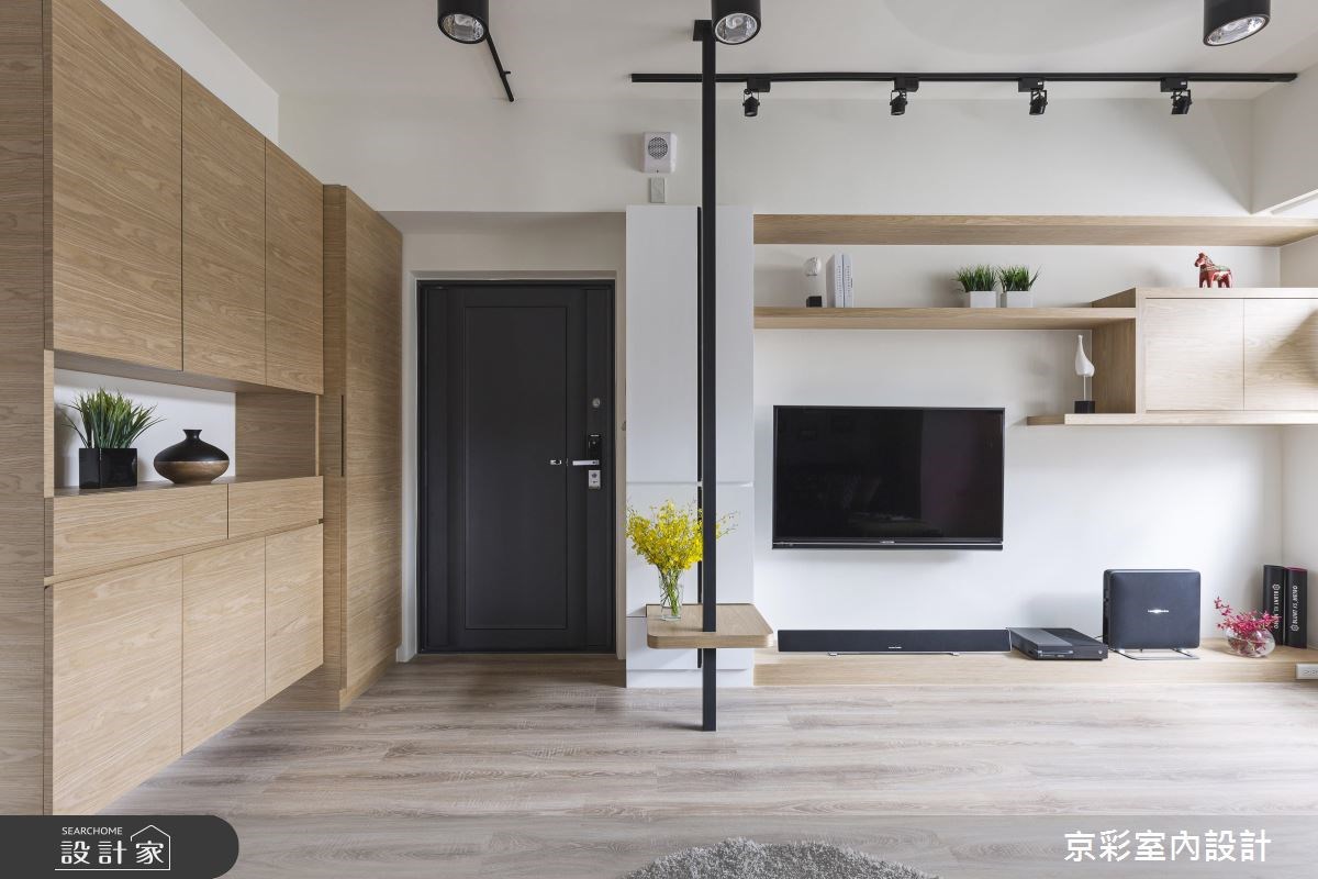 以雙面使用的牆體,巧妙區劃公共區與私領域,客廳區作為電視牆,背面則式主臥衣櫃,並且將收納隱藏於其中,滿足豐富多元的機能。
