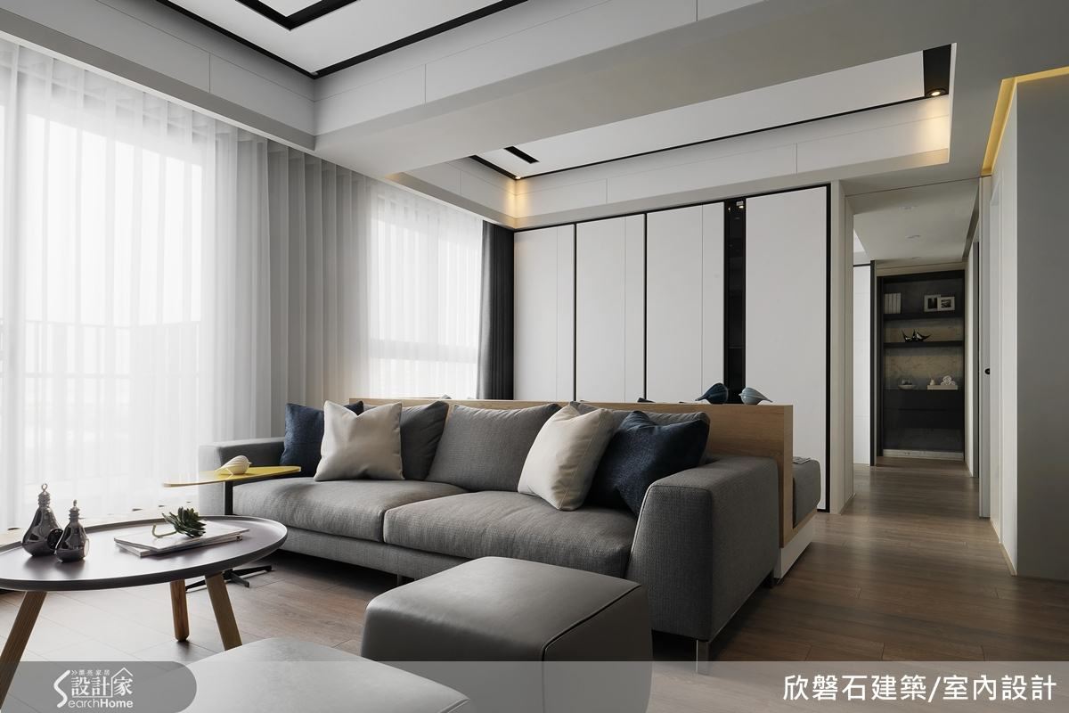 屋主擁有豐沛的藝術收藏,故讓沙發背牆採以清水模為背景,透過灰質色彩映襯藝術作品;餐廳區則規劃木作櫃體挹注收納機能,同時內嵌藝品展示空間,搭配燈光投射,烘托藝品的精緻質地!