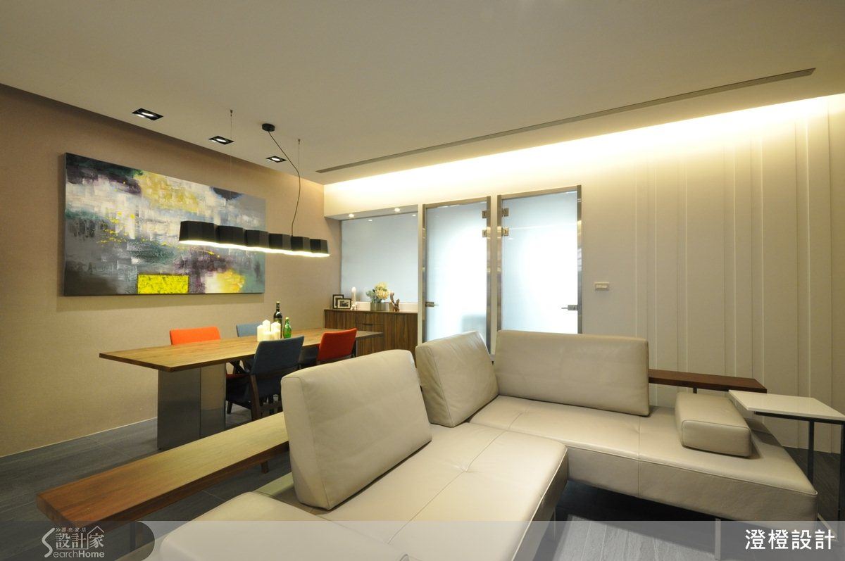 考慮到公共空間坪數有限,玄關的鞋櫃其實悄悄地向後退了 10 公分左右,採斜線方式與白色電視牆連成一片,隱藏動線導引,而滿牆的收納中不但下方刻意懸空,中間也做出木色的展示層架,以減緩櫃體的壓迫感。與電視牆接軌處,也做出立式的層架,讓這大一片白色有個喘氣空間,剛好也界定出客廳的使用區域,但視覺空間絲毫不受限,舉目所及盡是客廳範圍,感覺相當寬廣。