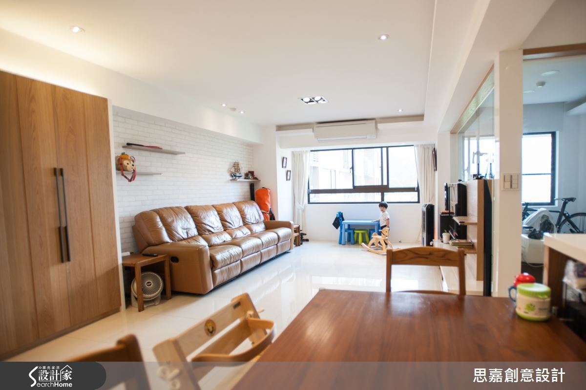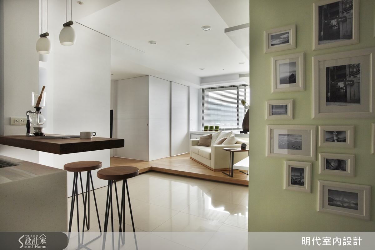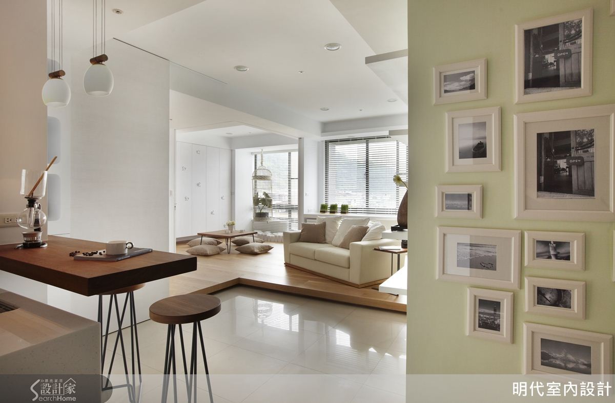 北歐風格向來以簡約、乾淨為設計的主要元素,逸喬設計在白色的基底空間中,大膽的於沙發背牆處揮灑一抹鮮綠。客廳窗邊以清透的薄窗簾讓光線得以灑入室內,讓無隔間的公共區域呈現明亮清朗的北歐氛圍。