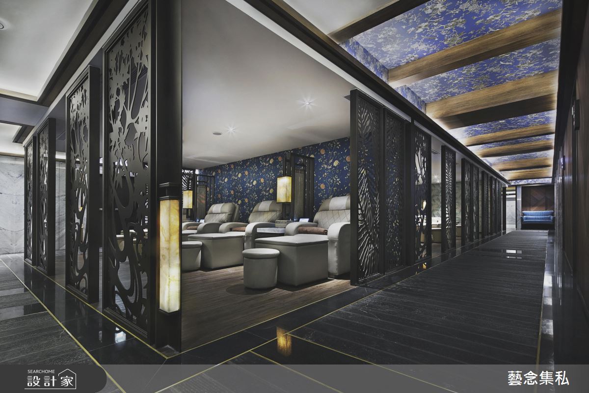 在這樣的底色之上,使用不搶眼卻仍有存在感的傳統藍白圖紋,鋪滿空間的前區,創造出一種對立卻不突兀的視覺。