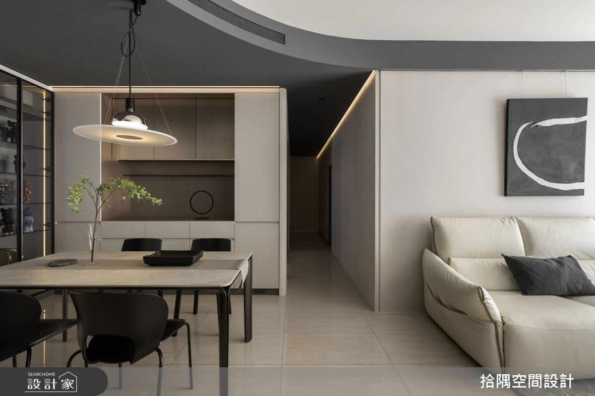 入口處,設計師於玄關壁面掛上畫作,右側鋪排墨鏡,映照出寬闊的過道視野,前方則規劃屏風做出適當屏蔽,選用特殊玻璃創造視覺變化、保有光線穿透,讓玄關進入廳區的視線得以獲得緩衝;進入廳區後,則巧妙於轉角處規劃淺色大理石展示平檯,擺放藝品塑造視覺端景,顯現細緻的生活品味,並以黑色鐵框結合玻璃組構書房隔間,延伸整體公領域視野,客廳電視牆採用黑色墨鏡打造,周邊刻意加入導斜處理,透過稜角、線條衍生立體的牆面表情;並讓墨鏡延續至餐廚領域,用以襯托白色中島吧檯的簡潔俐落,搭配白色烤漆廚具與吊燈,共組時尚優雅的氛圍;主臥則賦予寬敞範圍,以沉穩色調表達居者個性,並規劃頂天立地的電視牆作為空間軸心,保留睡眠區、更衣室之間的動線串聯!