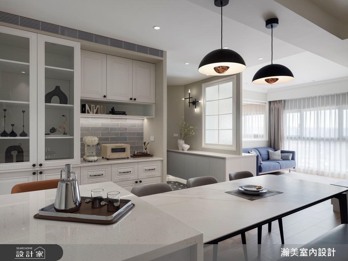 居家整體透過淺色木地板鋪陳,創造自然溫潤的生活底蘊,並以文化石砌築電視牆、襯托簡約氛圍,層架收納與櫃體則呈簡單不複雜的線條、與牆面一體成形,使長型場域在兼具機能之餘,也維持寬鬆舒適的空間感,讓每一角落充分浸潤到明亮採光;電視牆則與餐桌相連,形成延伸軸線,打造客廳、廚房之間的領域劃分,並在餐廚周邊配置櫃體、餐櫃大面延伸,創造豐沛的展示與收納機能;寢臥結合了睡眠、書房與衛浴主題,透過書桌圍塑出一方閱讀天地,且不浪費立面與書桌量體,賦予滿滿的收納機能,一旁則架高地坪、規劃玻璃隔間,做出進入浴室的轉換界定,讓起居功能各司其職,完善生活中的每個需求!