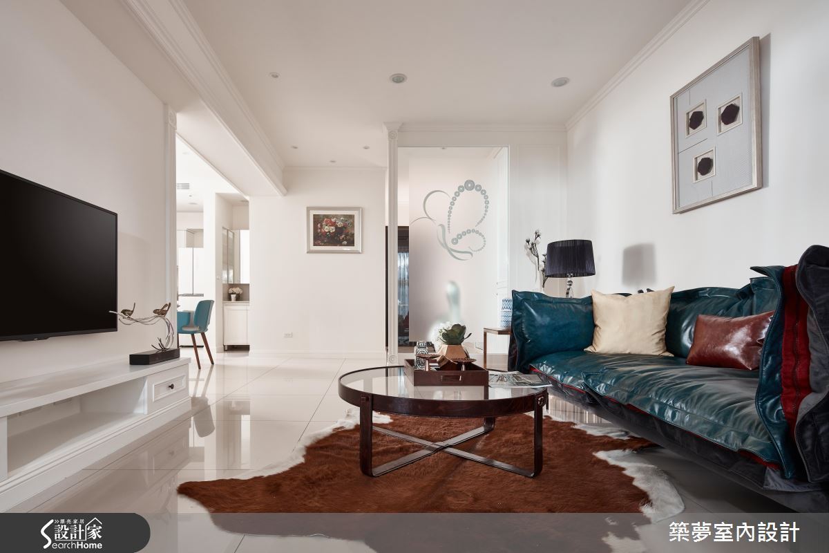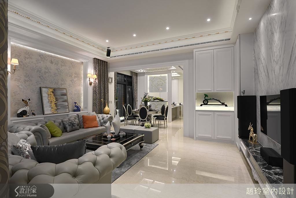 進門即可見展示櫃迎賓,對角則是醒目的白色精品櫃,利用廚房與臥室之間的角落打造而成,宛如與牆面門片一體成型,展示女主人收藏色彩繽紛的瓷器,簡約典雅,十分符合新古典的韻味。