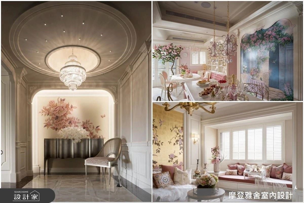大宅的屋主往往都有招待賓客的重要需求,因此玄關的氣勢營造不可輕忽。地面以大理石拼貼為引導,端景則是壁爐與對稱的羅馬柱,兩側則是鑲金框的雙面古典展示櫃,精緻線板讓牆面與天花的設計語彙相呼應,氣派與藝術完美融合。