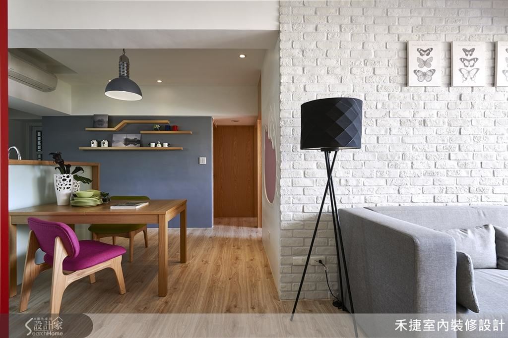 而基於健康安全性,設計師大量施作溫潤環保的建材,採木質、珪藻土等建構主體,搭配磚材、彩色軟件的點綴運用,在簡約之中玩出繽紛趣味,植入親切的北歐風格;同時考量到屋主身高較高,刻意不將空間降板太多,保留天花的原始表情,把管線裸露予以噴白處理,在北歐基底中適度地填入 Loft 語彙,讓兩種風格無違和搭接,展現設計師混搭比例的功力。