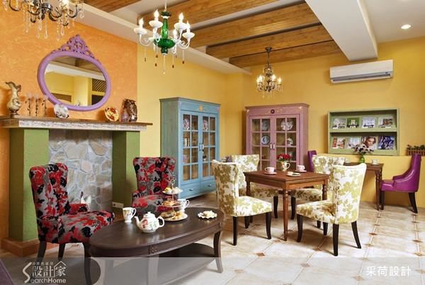 從玄關入門處開始,即以手繪隔屏做出動線導引,引領人進入夢想世界,並將木造材質結合既有建物門片,營造與世隔絕的古堡風格;餐廳藉由大面窗連結陽台,讓視野可延伸至戶外景色,於天花加入金屬餐燈,牆面施以仿壁爐造型,搭配延伸開放的格局視野,建構大器工整的端景畫面;客廳、餐廳之間以家具簡單區劃,同時保有場域之間的交流對話,窗面一貫地延續圓弧語彙,並配置木百葉創造紓壓氣息與調節採光,客廳盡頭則大膽規劃一整面泥造牆面,搭配燈光投射型塑立體視覺,構成活靈活現的古典壁畫,且在牆面融合展示櫃體,內部暗藏儲物空間,開啟機能的趣味表現形式;起居書房內藉由挑高斜木屋頂設計,挹注峇里島度假風韻,將手繪油畫的繽紛花樣揮灑於牆,帶來度假感十足的南洋風情!