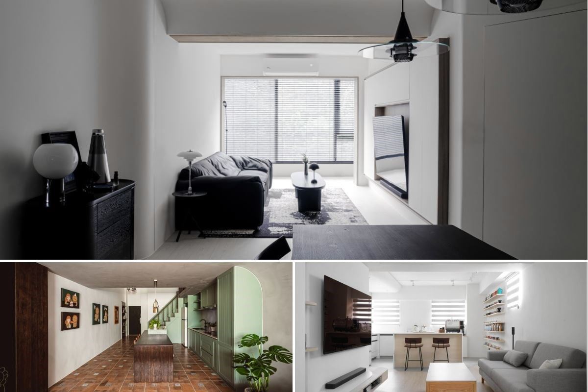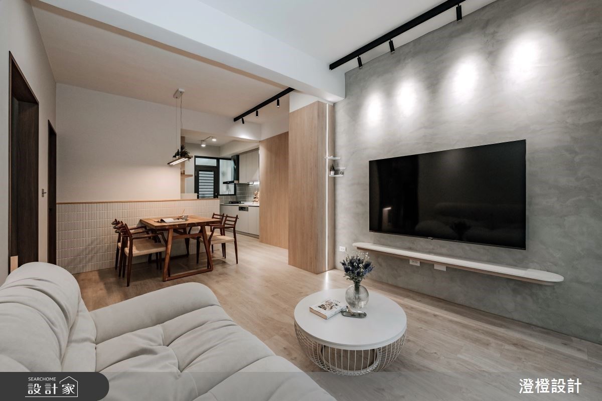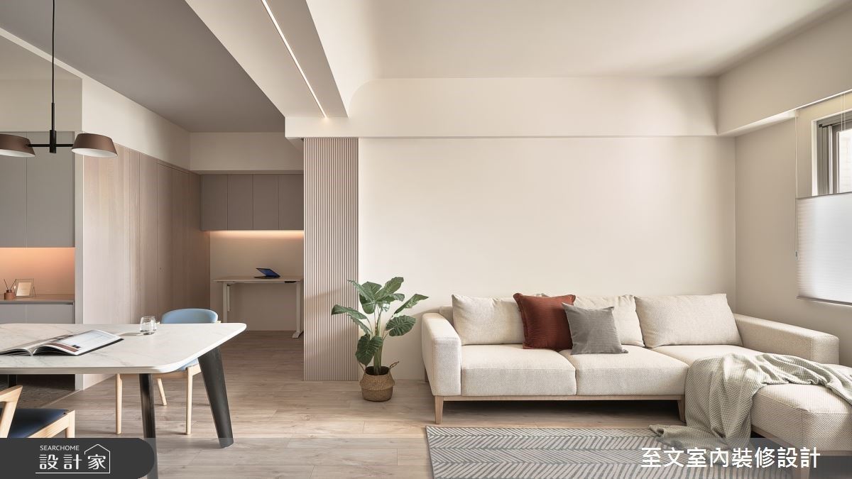 為了保有整體通透性,設計師於入門玄關處規劃線性格柵,區劃入口與廳區領域,讓採光得以自然流通;客廳則不做多餘繁複的設計,使立面保有純粹色彩,僅加入簡單線條修飾,搭配窗外光影的自然寫入,型塑美好生活光景,並在主牆嵌置延伸的置物平檯,作為收納展示的絕佳之處;餐廚領域融入開放設計,將天花橫樑作木紋包覆處理,修飾壓迫視感,而除了完美收整電器櫃體之外,更添入鮮豔的綠色黑板漆提升空間彩度,讓孩子可自由於牆面上塗鴉;主臥床頭添入實用的收納機能,並在中段加入鏡面延展視覺、增添櫃面變化性,地面則鋪述深色木質,帶出穩重紓壓的調性!