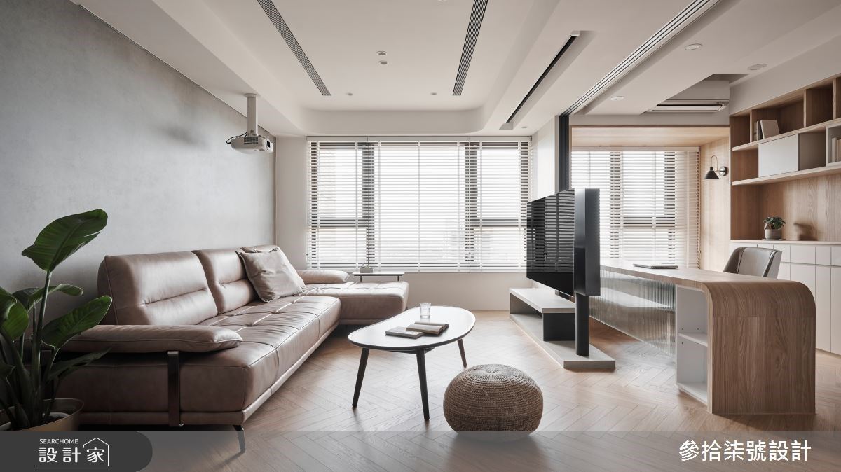 室內以純白色作為基底,從玄關進入後,設計師利用地磚的特殊切割,刻畫出屬於一家 4 口的家徽圖騰,凝聚家庭精神。客廳處的電視牆取代一般沉重的石材質,特別採用薄片石材,凸顯出清爽、自然的特質。至於收納方面,客廳背牆與臥榻下方,皆安排了充裕的儲物收納設計,藉由造型門片的修飾,將雜亂感藏於無形,描摹優雅迷人的美式風精神。廚房和餐廳採用感應式拉門劃分界線,不但可以隔絕油煙,自動開關的電動感應設計,即使手上端著熱湯、熱菜,也能輕鬆在廚房出入。設計師將屋主喜愛的紫色融入主臥室的純白氛圍中,並運用百葉窗為室內調整舒適的光度,擺上一張柔軟的沙發,成為可以慵懶放鬆的休閒小角落。