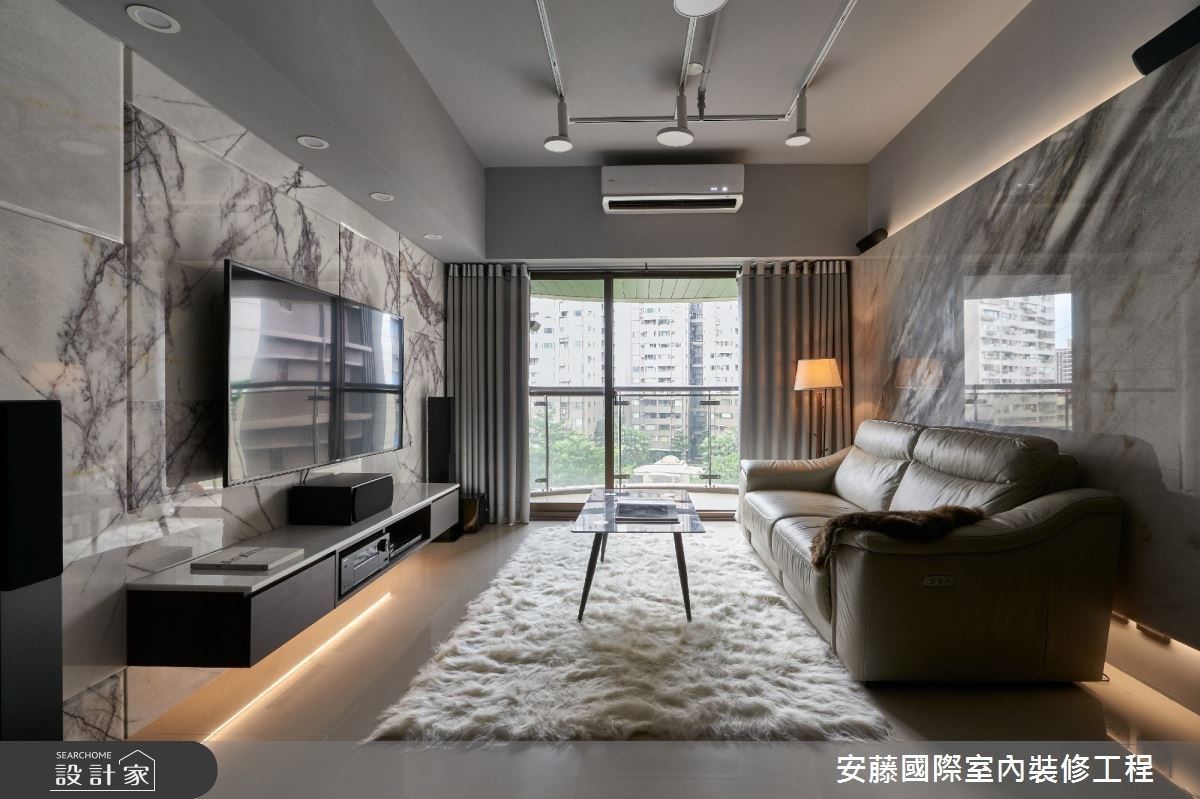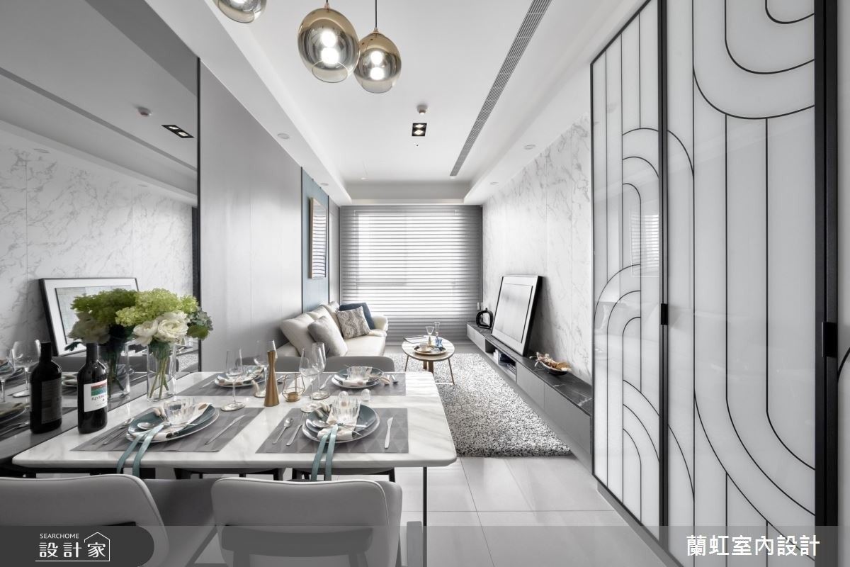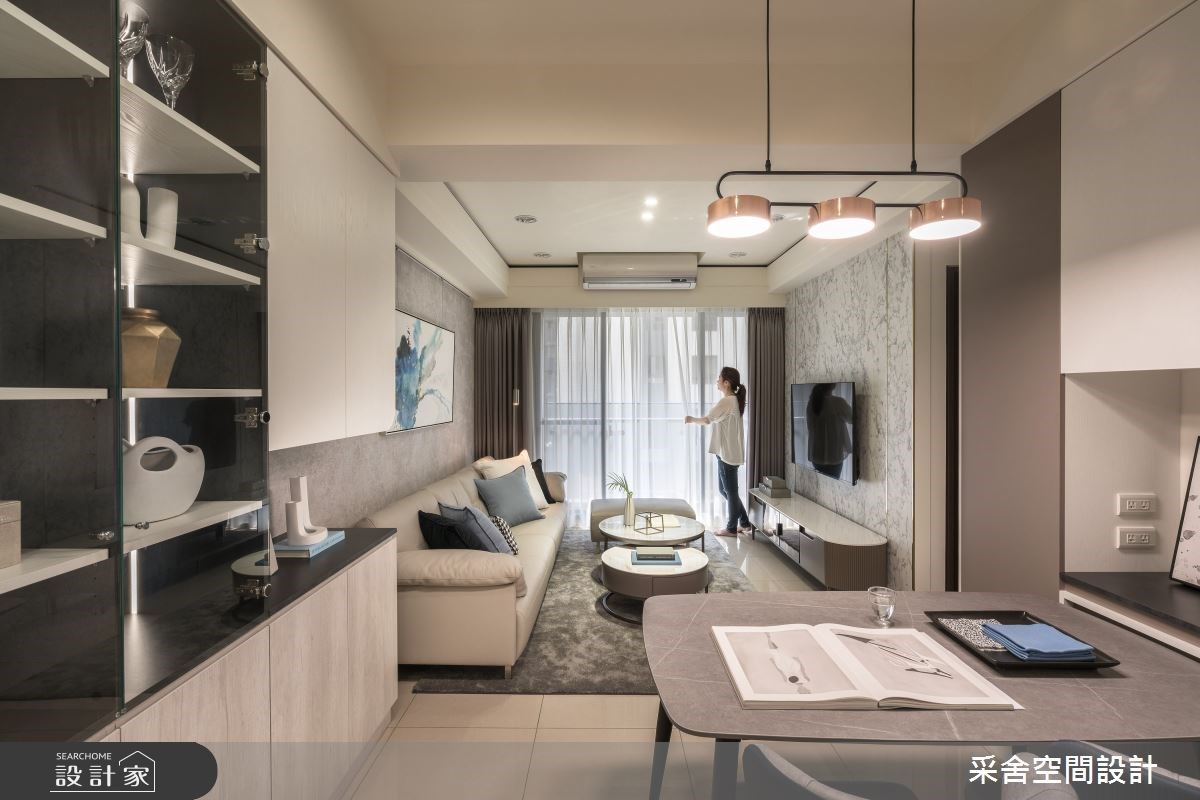 屋主兩人喜愛簡潔俐落的現代風格,並希望充分利用有限的坪數,讓每個空間都能具備收納功能,設計師運用簡約的分割線條,勾勒出現代風格的時尚設計感,除了豐富的櫃體收納量,也由飛機空服員的工作檯面進行靈感發想,在內部貼心規劃了一道簡易餐檯的收納設計。格局安排上因應極佳的地理位置,無論在客廳,或是在浴室泡澡,都能欣賞到窗外的美麗夜景。客廳電視牆後規劃為獨立的書房區,藉由通透的玻璃介質,與外部保留視覺的穿透性,同時也放大了廊道的空間感,帶來舒適寬敞的感受。臥室私領域使用霧化的玻璃拉門,既保有隱私性,光線也可以自由流動,並以玻璃窗景延伸浴室和臥室空間,讓兩個領域相互達到視覺放大的效果!