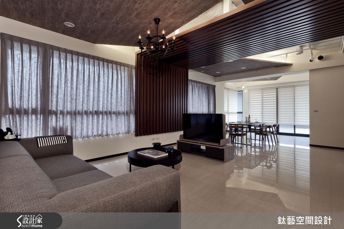 客廳,設計師讓電視牆結合展示意義,透過俐落的藝術線條隱去量體感,搭配家飾收藏品的陳列,增添日常生活感,使牆面有如一座一體成型的美學裝置,而與之對應的,是以紅磚鋪陳的沙發牆面,復古的質材磚色、呼應 Loft 的經典元素;沙發牆旁則銜接餐食吧檯,自成一格地座落於空間之中,形成輕巧的用餐地帶,並藉由不鏽鋼桌面、手繪黑板牆等妝點,呈現剛硬俐落、不乏趣味生動的藝術調性;同時,也可見到門片線條的修飾隱形,不著痕跡地融入在木紋之中,展現乾淨的立面表情,步入臥房內,則脫離了粗獷的鐵件與紅磚,以木質調搭配布面壁材,烘托舒適放鬆的休憩氛圍!