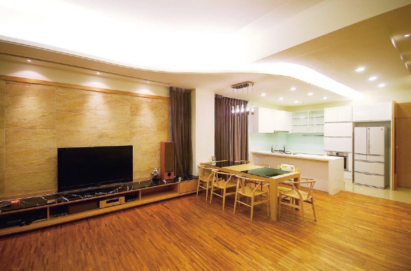 公領域以白色、木色作為基底,採用木地坪鋪陳全室,搭配落地窗的採光映照,烘托廳區的寫意氛圍,主牆則賦予獨特表情,融入文化石為背景,巧妙給予局部留白,並以一道木皮造型延伸天際,透過延伸脈絡及溫暖木皮象徵大樹,型構守護與庇蔭的喻意,而冰冷的金屬鐵件飾邊,更適時調和了整體的木作暖意,勾勒時尚兼有溫馨感的生活氣場;同時,將文化石延伸至餐廳領域,藉由文化石的包覆修飾結構柱體,再藉著牆面深度與木作掩飾,加入可抽拉式的收納櫃體,充分運用居宅坪效;來到寢臥,則可見大容量的木質衣櫃,兩側加入工業風鐵網元素,保留局部的展示透空,在粗獷與溫潤之中,帶入居住者的個性魅力!