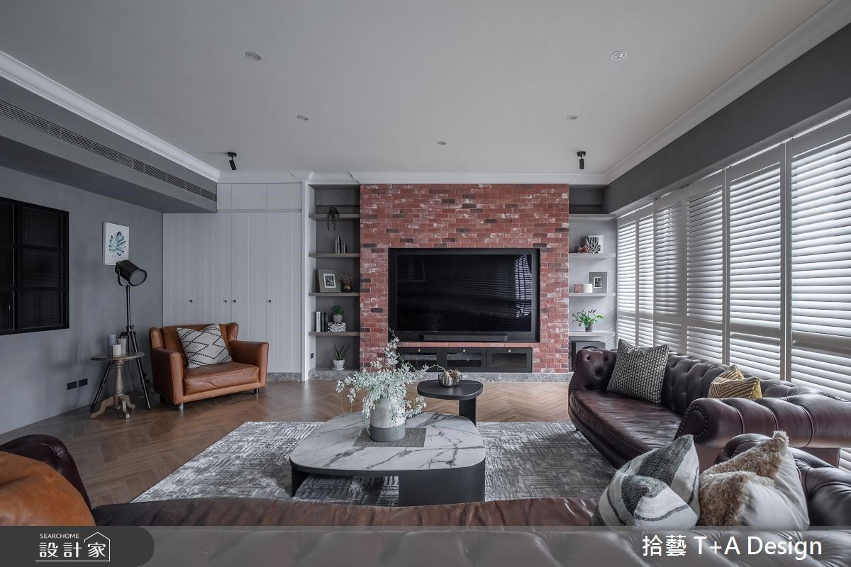 創造隔間牆,區隔出內外領域後,客廳明顯內縮,後方的廚房與書房領域明顯較大。因此,將電視牆拉滿整道牆面,一氣呵成的設計手法,替客廳拉闊空間視感,而後方的書房領域更利用可加長的伸縮桌,搭配純美式的收納櫃體,上方更架設鐵件單槓,讓屋主做為強身運動之用,滿足娛樂、展示等生活一切機能所需。