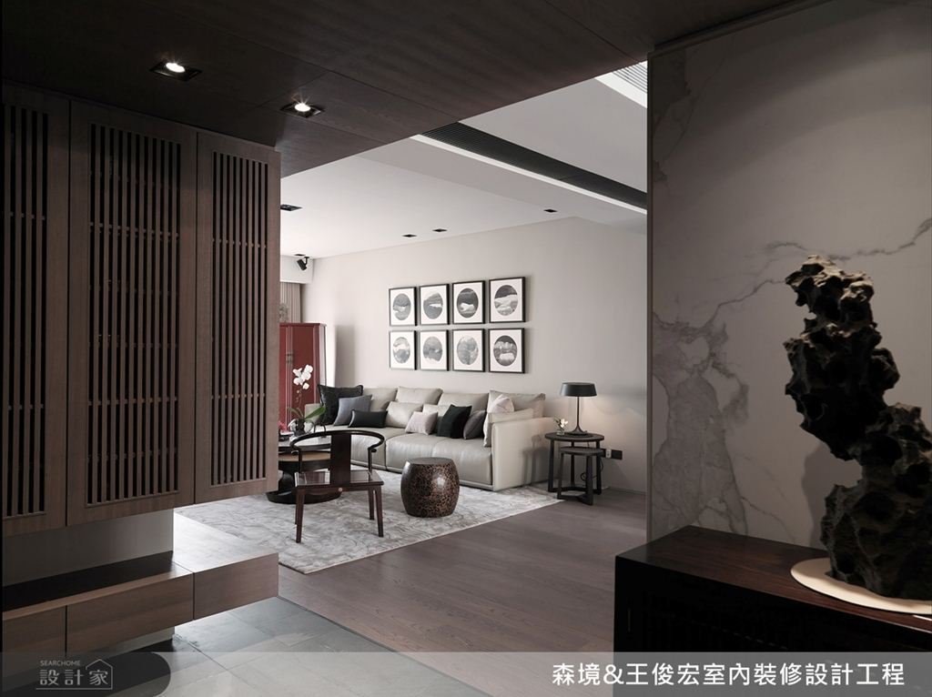 整體空間裡,藉由冷硬質材雕塑出空間表情,無論是大理石打造的電視牆,鐵件勾勒的鏤空燈飾,還是門片以鍍鈦打造的獨特手把……,乾淨俐落的線條勾勒出精緻室內細節;在局部揉和原木肌理,且於門扇與壁面覆以奶油色系,調和出溫潤、雅緻的空間表情。