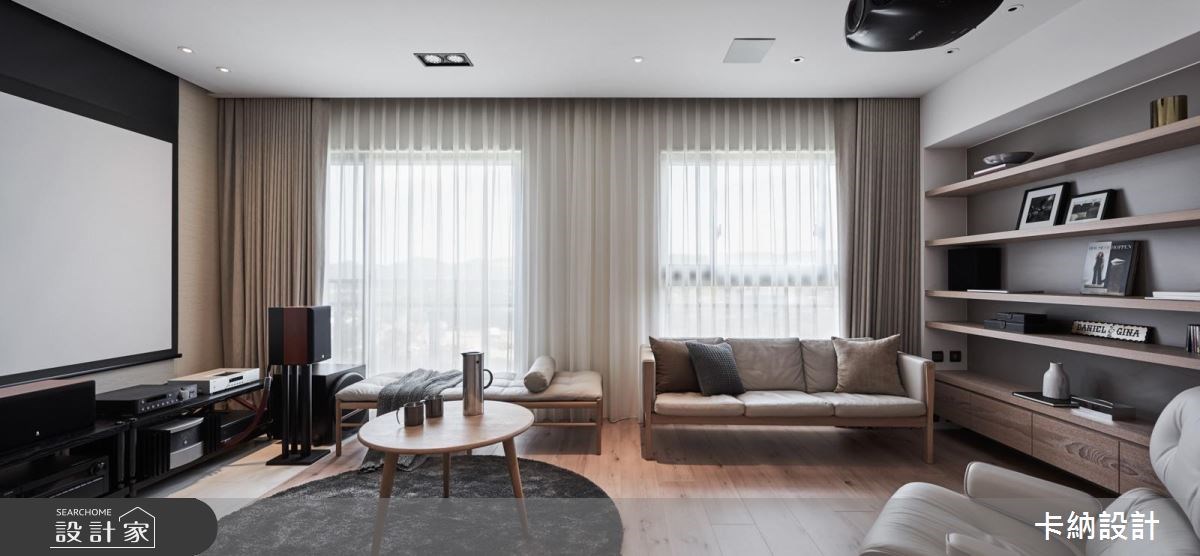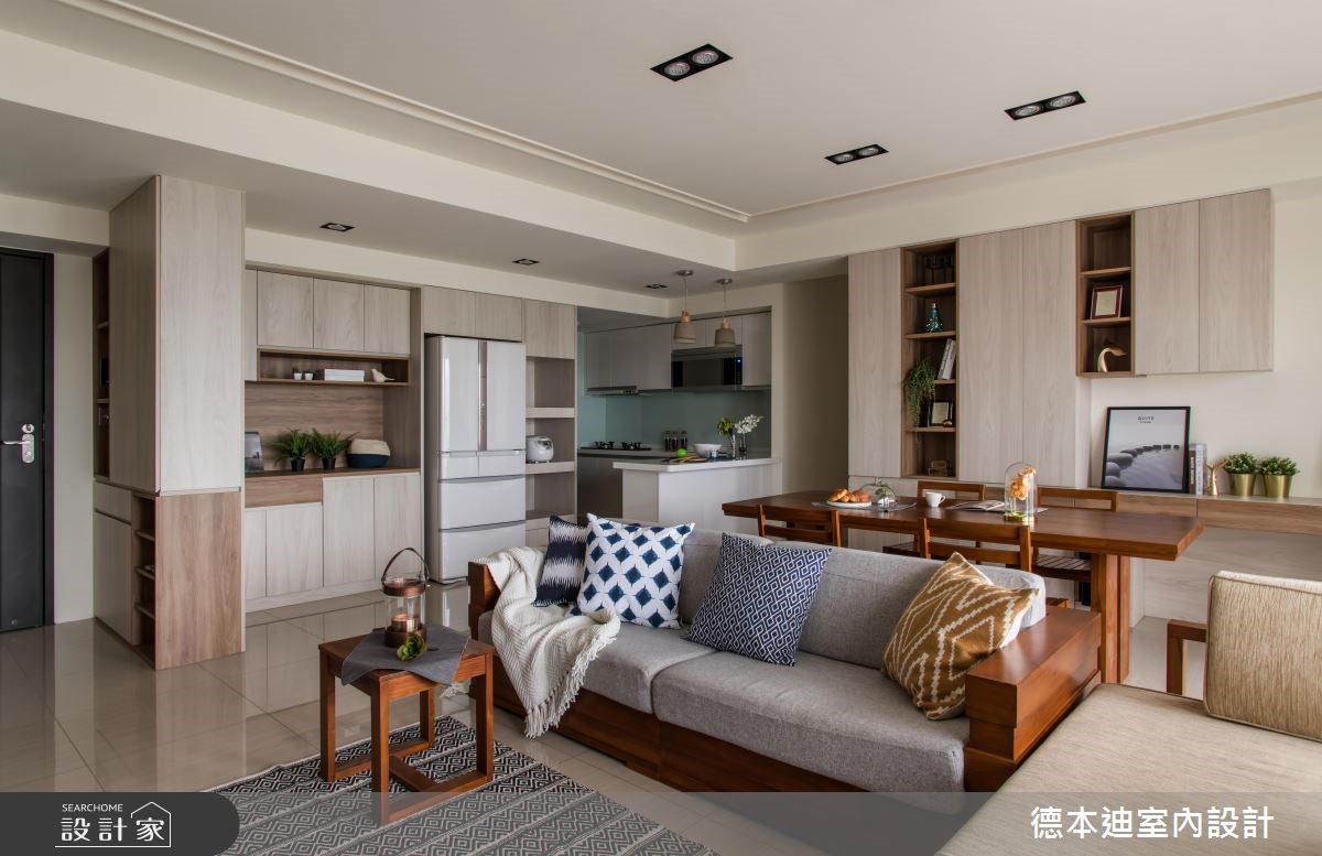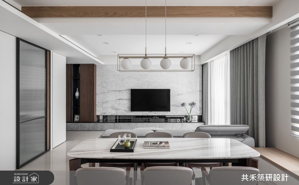 由於一家 4 口需要寬敞的互動空間,設計師利用開放設計開放設計串聯前後段的客廳與廚房,為了保留最寬裕的行進動線,設計師利用中島吧台取代制式餐桌,讓設備專業齊全的 L 型廚房擁有順暢的烹飪體驗,不再與家人產生隔閡。沿窗區域設置休閒座位與客廳的沙發讓家人可隨心挑選自己鍾愛的位子,卻不失互動的可能性。針對建材選擇,設計師以純白色調揮灑,悉心以黑鏡、黑色烤玻等材質穿插在壁面與天花,更在電視牆選用富有自然紋理的石材,增添大器質感。