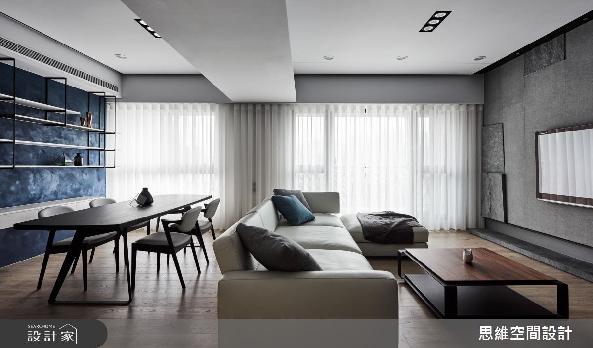 將原先的陽台構造納進室內設計,改為落塵區並增設與電視牆結合的收納鞋櫃,接著採用透光屏隔將光線引入公領域,化解單邊採光不均問題。考慮到由於客廳空間沙發與電視牆間的距離較短,巧妙將機櫃收納於與後方主臥共用牆面的衣櫃下方,並在立面使用淺色大理石材,配合長邊鋪設木地板與天花木皮,放大空間、延伸視覺感受。除了以開放式設計串連客廳與餐廚,更將收納櫃與餐櫃結合,達到機能延續、抹除界線的目的,更在廚房牆面貼上玻璃,可讓孩子們自由作畫。