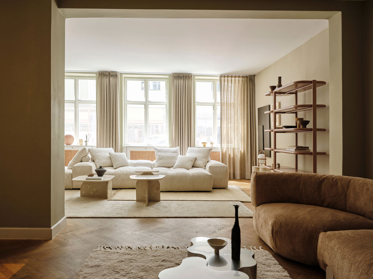 設計師於客廳角落飾以局部鏡面,讓視覺不因牆面而有所阻絕,不僅形成延伸放大感,也映照出更明亮的空間印象!