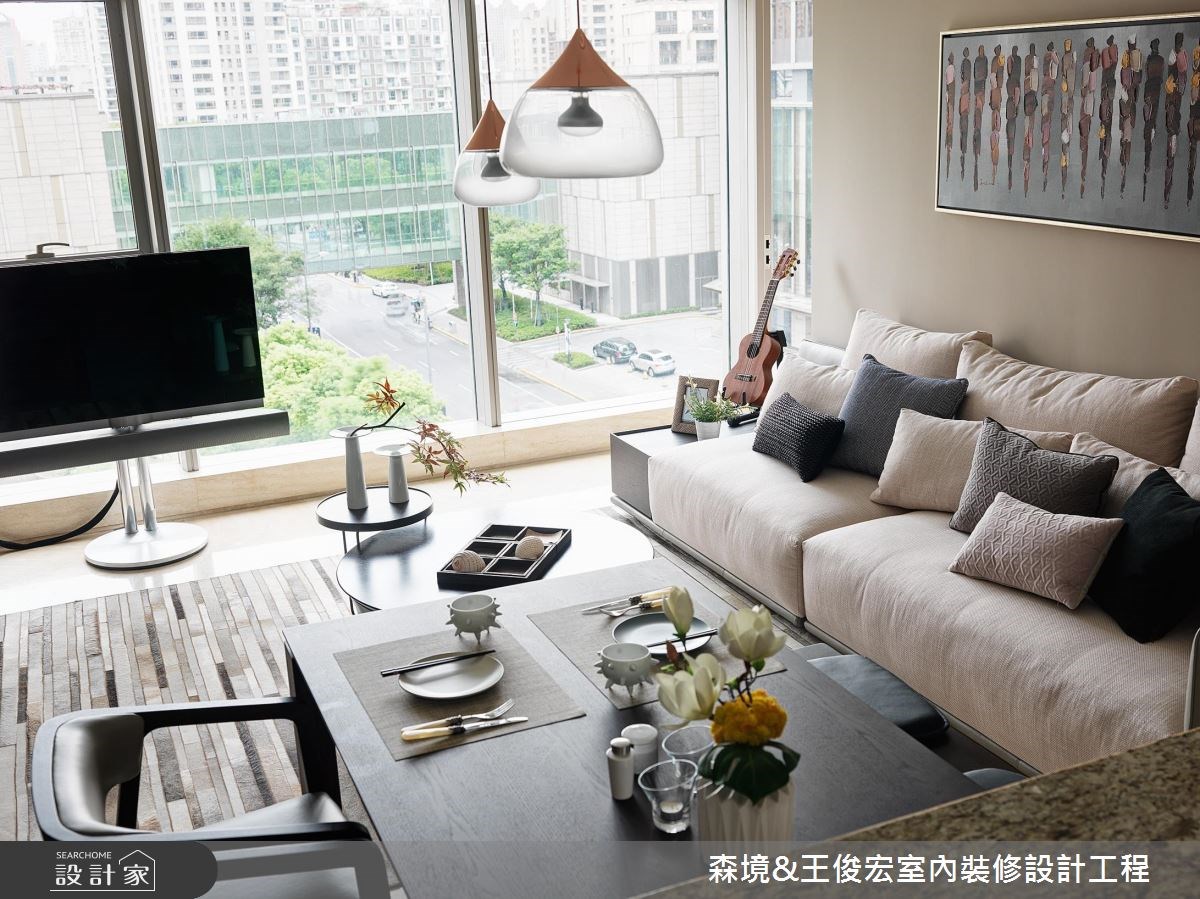 由於本案居住人數單純,讓空間可以更加隨心所欲地應用,設計師將客廳安排在採光最充沛的窗邊,並巧妙利用木地板與六角磚劃分客廳與長型窗台區域。電視牆採訪清水模漆,與沙發背牆的嫩芽綠達到色溫相互平衡的效果。針對格局規劃,多功能書房與臥房皆以玻璃、拉門以及櫃體取代隔間牆,讓客廳、多功能房以及主臥得以達到無限延伸的穿透性,隨喜好與需求改變空間的形狀與樣態,讓格局不再侷限於制式的框架。