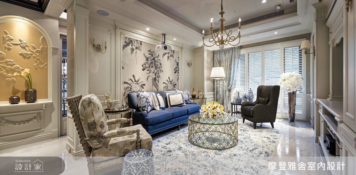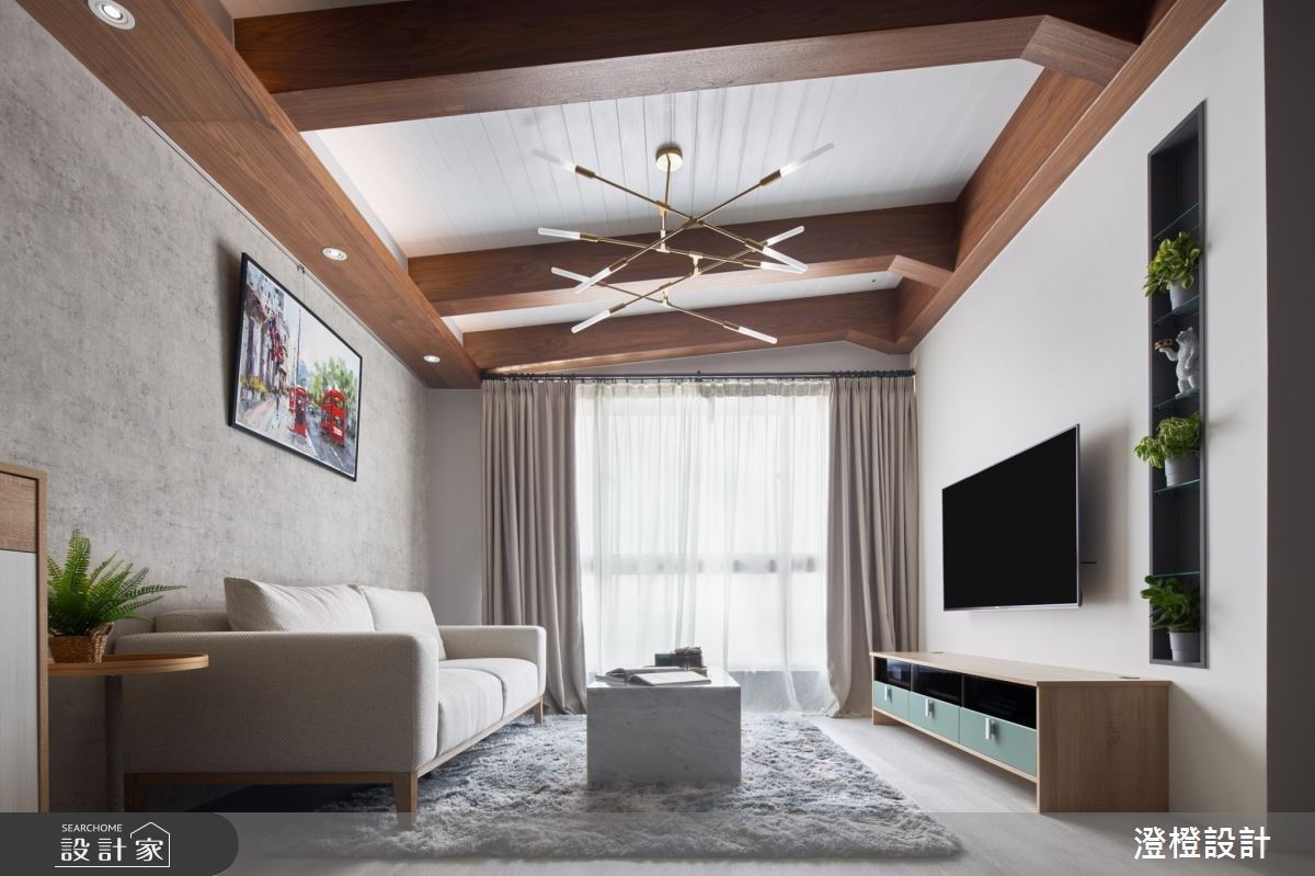 設計師先將電視牆轉向,讓沙發靠牆,有更大的空間能更好的展現大器;仿石材的低矮電視牆及通透茶玻,以 L 型拉門圍塑出半開放的書房,採光更能連貫分享,有坐榻可坐可臥,平時是孩子的遊戲室,也能作為客房,未來孩子若需分房也足夠使用,因此刻意以架高平台劃出明確界限,而牆面的大型收納,其實是男屋主眾多鞋量的收藏區。