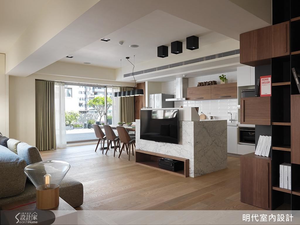 白色為基調,搭配淺色木皮的溫和配色,貫穿整個公共區,利用不同地坪材質,為客廳、餐廚區,作出隱性空間界定,使空間有放大效果。顛覆客廳主牆以華麗石材鋪陳的手法,設計師將入門視線直擊的玻璃主牆,用歷史軸線般的展示牆陳列對屋主有特殊意義的文字、圖片,如同家族共享的密碼,更添設計趣味。