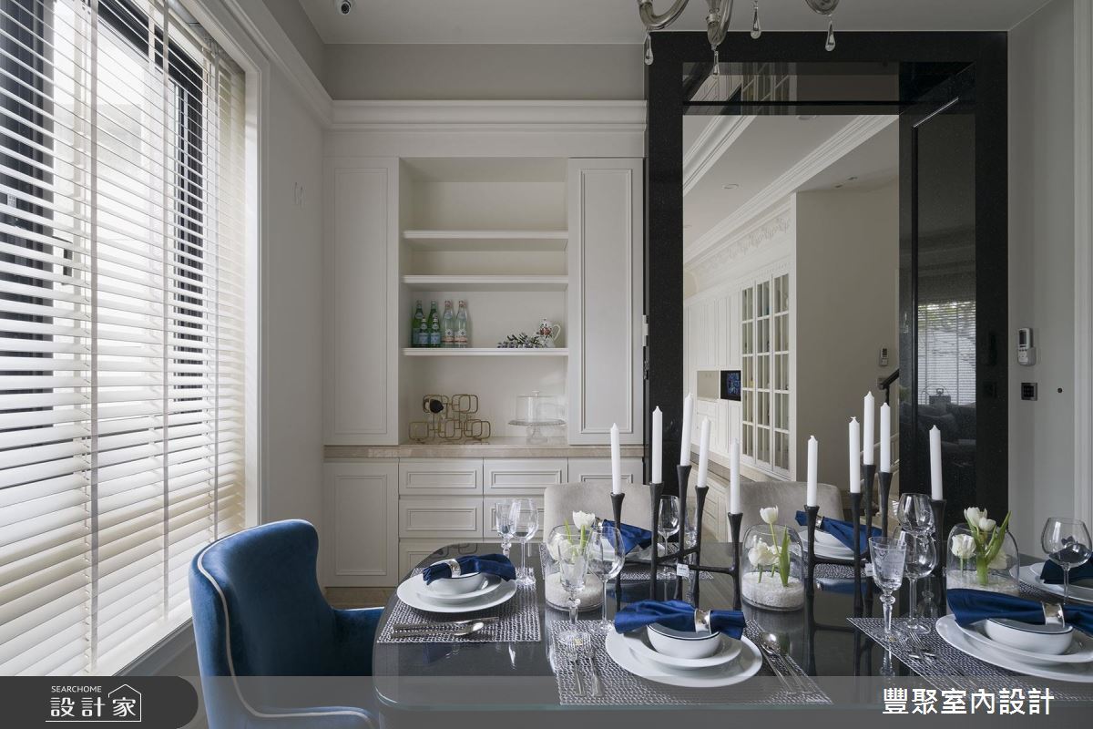 這間新成屋擁有足夠的空間與挑高,設計師為了增加空間的層次,採用實驗性的手法在餐廳增加橫跨餐桌的樑,創造主題性,提升視覺豐厚度。原本考量有足夠的空間可做實用的機能設計,然而設計師反而在此增設一個以太陽般的圓框造型加上黃金漆的日式意象牆,並融入弧線設計,除了呼應公共空間的手法外,合乎業主對於美學與風格的喜好。